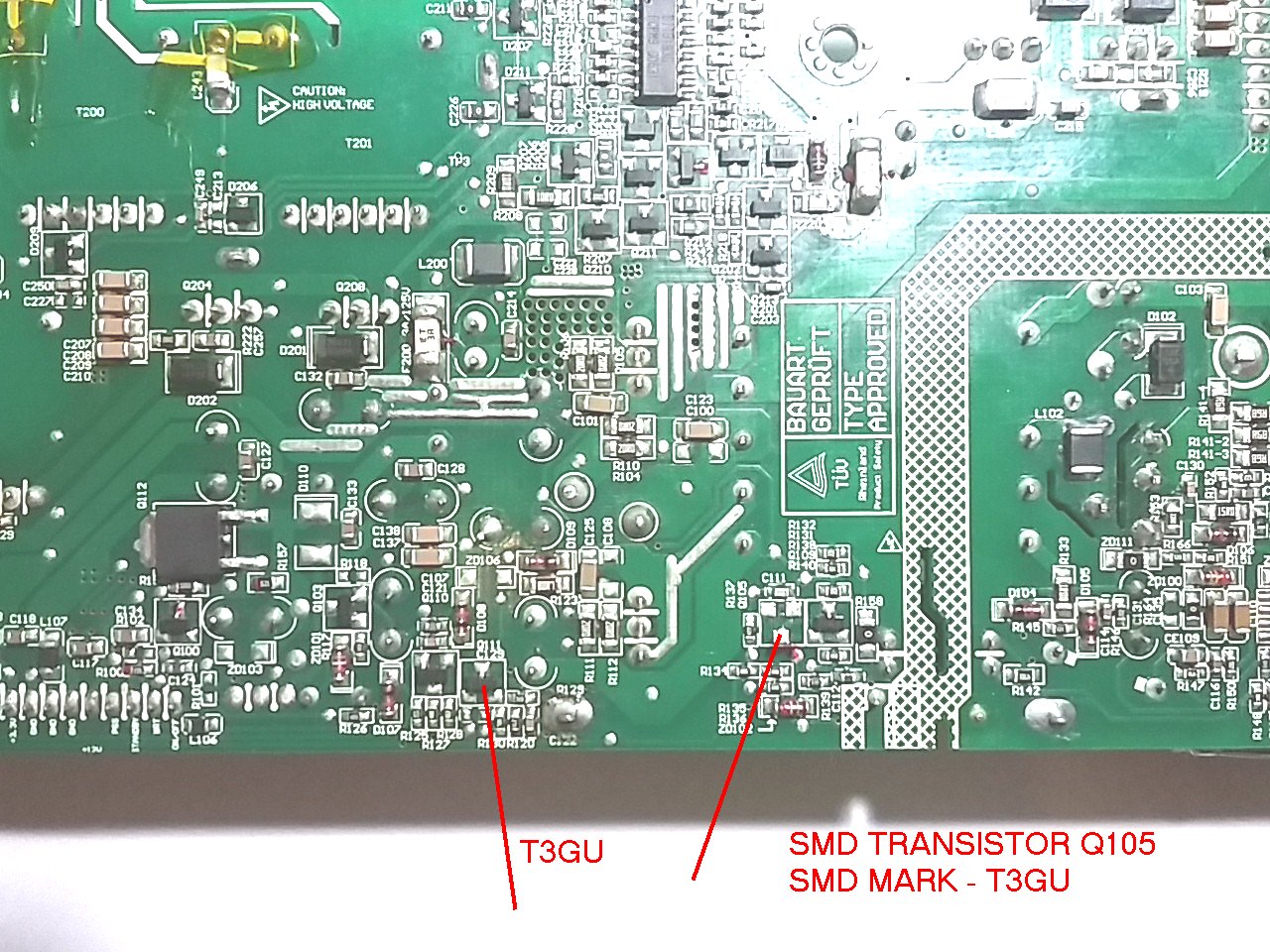 I found faulty SMD transistor with SMD mark T3GU, position Q105.
