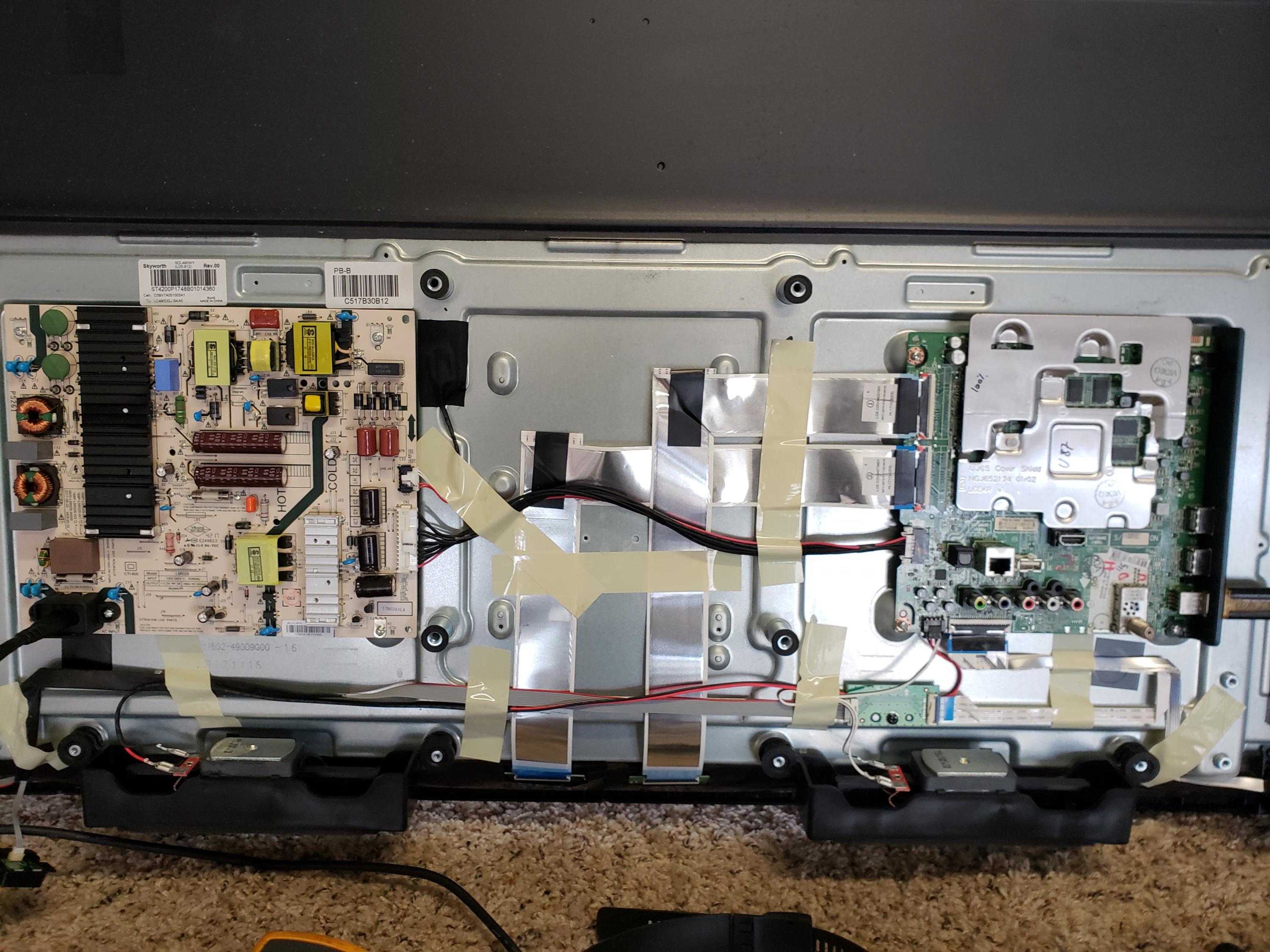 This set will fire up, complete initial setup screen info, language, country, time zone. when select OK at end of setup goes to blank screen. Upon power up standby LED blinks three times. No response to remote. will not take software update through USB port. I noticed that with set off, all 13.2 volt pins show 12.0 volts. Once fired up shows 13.2 volts on same pins. Electrolytic caps close to the plug all show 12.0 volts in standby. LED Outputs are both 64.75 steady instead of 66 volts. Two main boards exhibit same behavior. A third main board would sometimes go into menu and even display PIP video and sound in menu on input selection screen. When input selected (HDMI) only audio came through, no display on full screen, this board took software update.