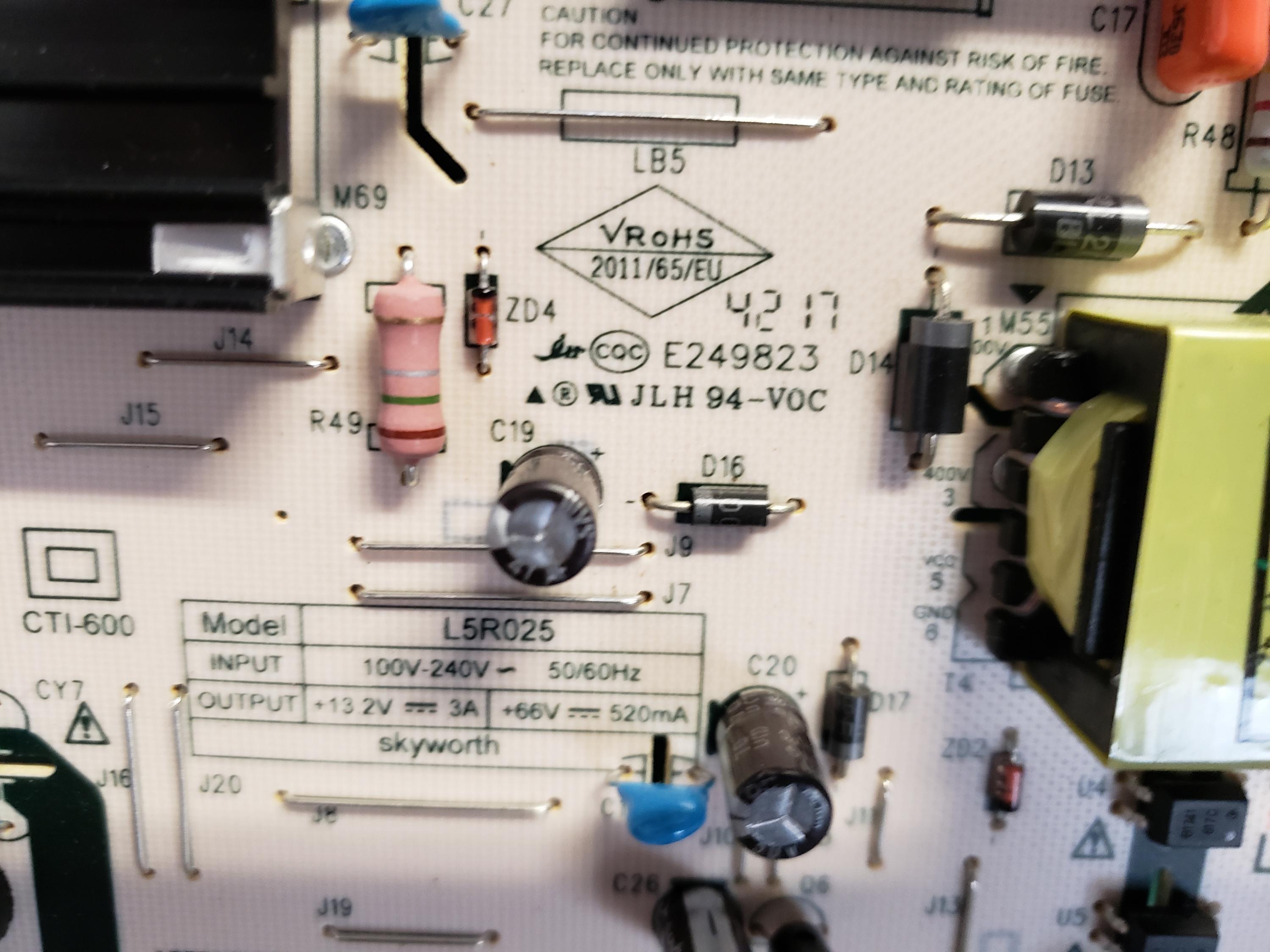 With everything connected, turn on tv check the voltage of the legs of the big capacitors C2 and C3, red lead on positive leg negative lead on negative leg, careful when testing as this is the HOT/DEADLY side of the board.