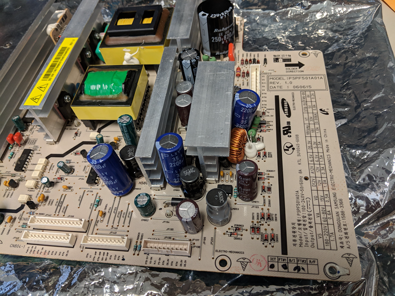 If I remove all of the external cables to the power supply, I can jump the PS-ON line to ground and the power supply will turn on with all correct voltages. However, judging by the pitch of the sound coming from the power supply, it is taking 3-4 seconds to stabilize. The next interesting point is that if I let the power supply stabilize, remove PS-ON, and then immediately reconnect all of the external cables, the TV will power on and act normal. If I keep everything hooked up this way and have the TV powered off for more than 5 minutes, it will go back to the constant relay clicking. So to me, it seems like something on the power supply is taking too long to power up and it causes an endless power cycling loop. It will do this loop if the main board is connected (the high voltage inverters don't make a difference either way). This would point to the switched D5.3V line or switched D12V line. The biggest rub here is that somebody else has tried repairing this power supply already. A bunch of the larger caps that fit, but are not stock are installed in certain places. My current theory is that these caps are too large (in capacitance) and when the power supply turns on it takes too long to charge the caps up before the internal fault timeout occurs. Meaning, the voltage rail takes too long to come up and the power supply shuts down and resets. What I need to know is what the original capacitors were so I can replace them with the same values. I cannot find the schematics for the power supply alone. The service manual does not have the power supply schematics and every picture I can find is just a top down view so I cannot see the values. I can tell that they are different caps than standard pictures though.