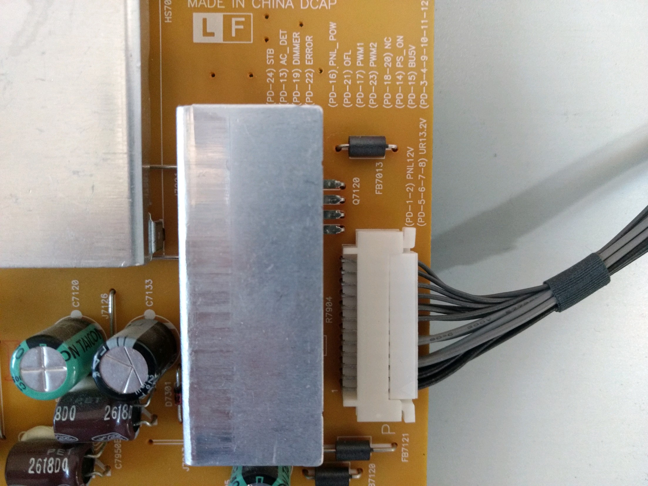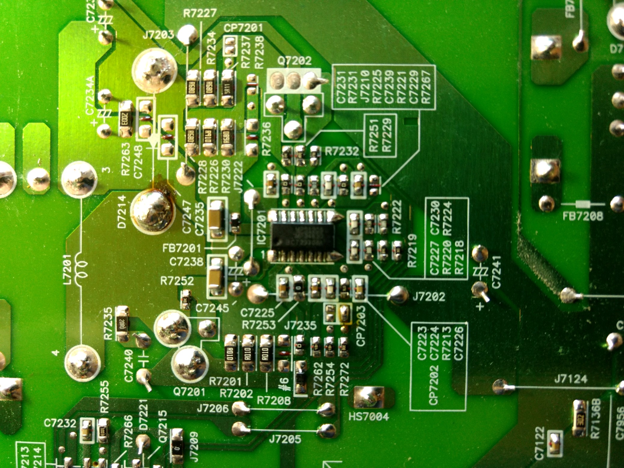 So it looks like there's an open at the LEDs driven by pins 1-13 and 1-15…but what about that 150V spike on the same line? That didn't seem right so I pulled the PSU and had a look at IC7201 and all the components in-circuit with it.