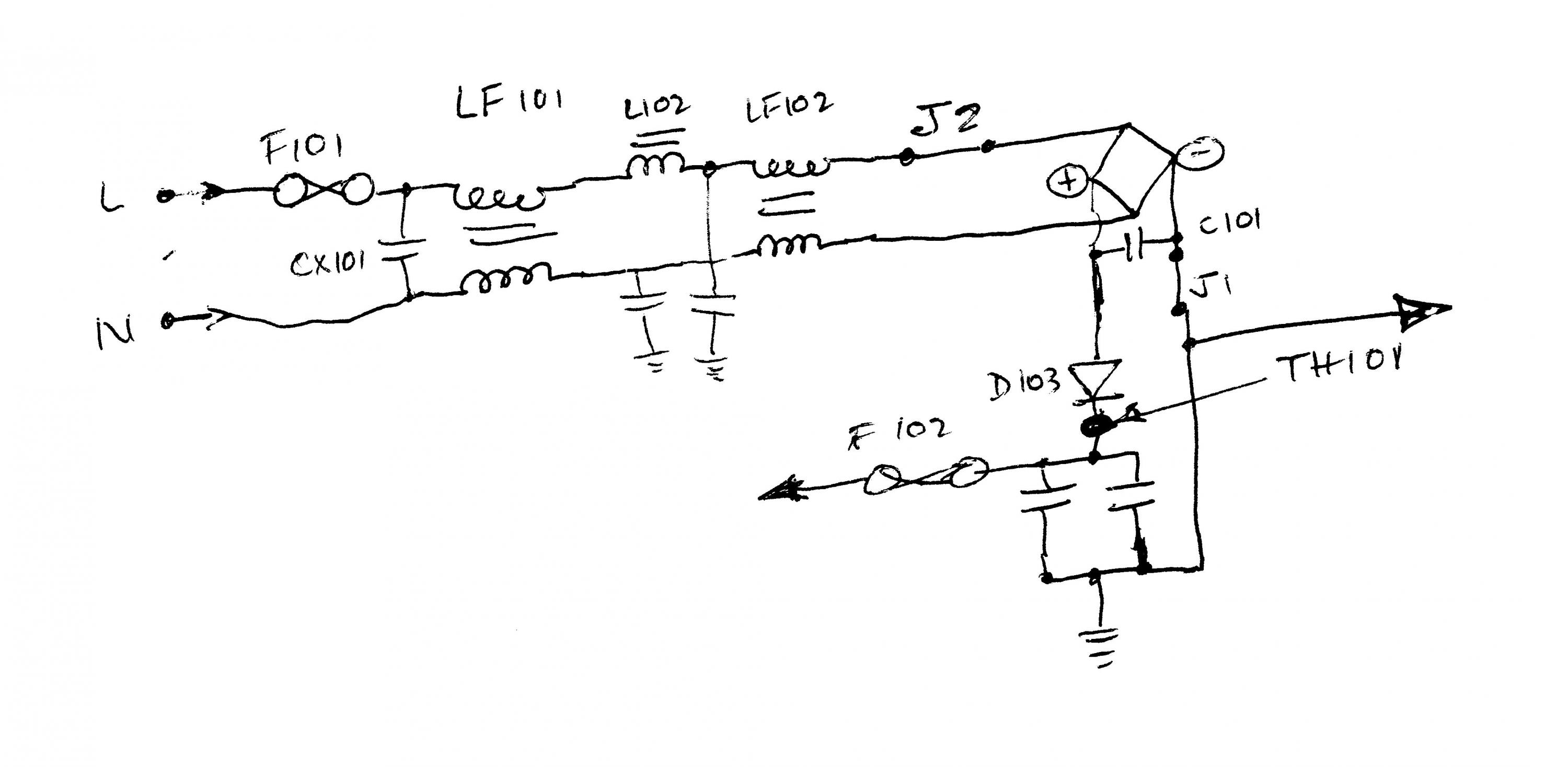 Power board shows a failed diode and a burst ceramic-body main fuse, the apparent source of the noise. Have posted in the schematics area with pic hoping someone can ID the board and maybe lead to a schematic.