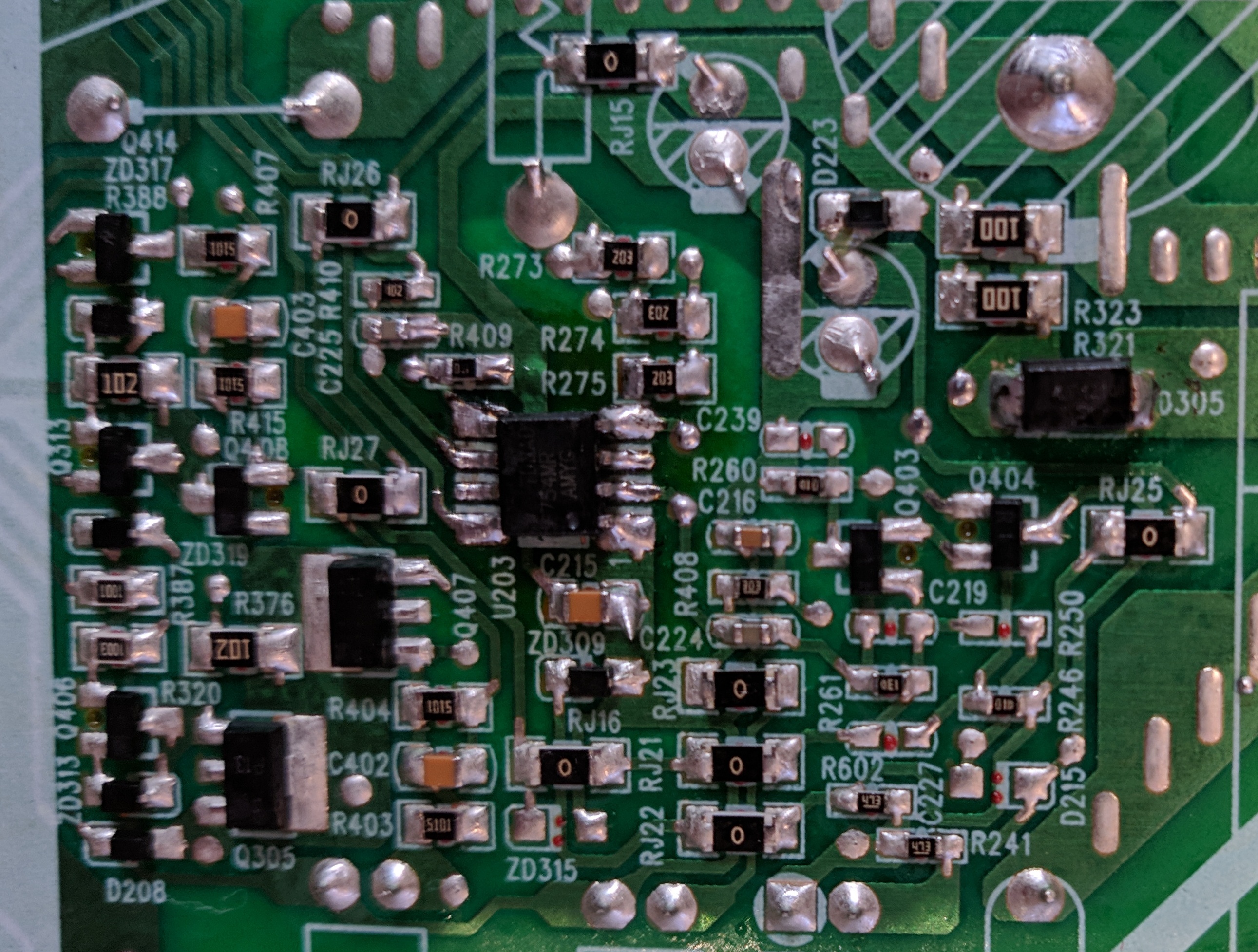 The two main 450V 100uF filter caps marked as CE202 and CE201 both measure at 167.4V across their legs while the TV is powered on. All 3 fuses are not open.