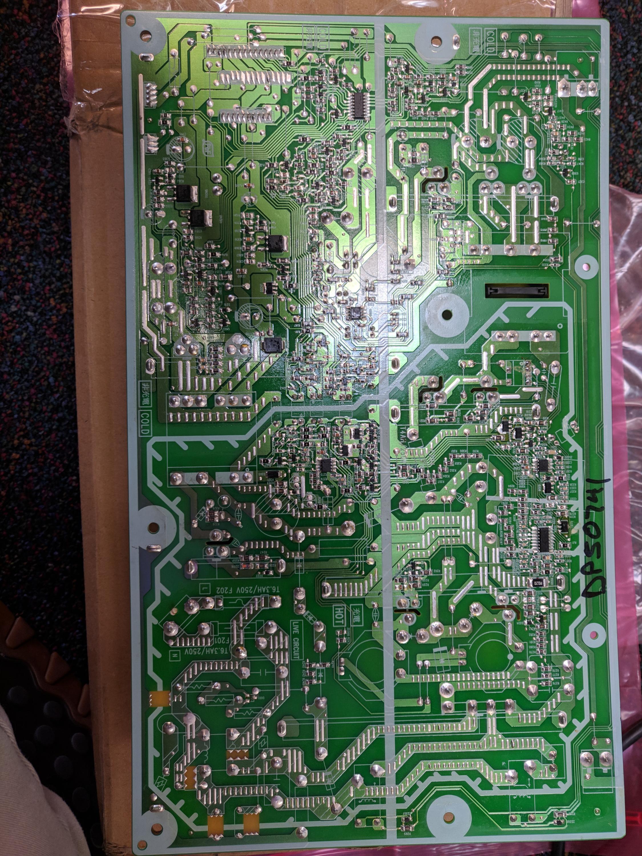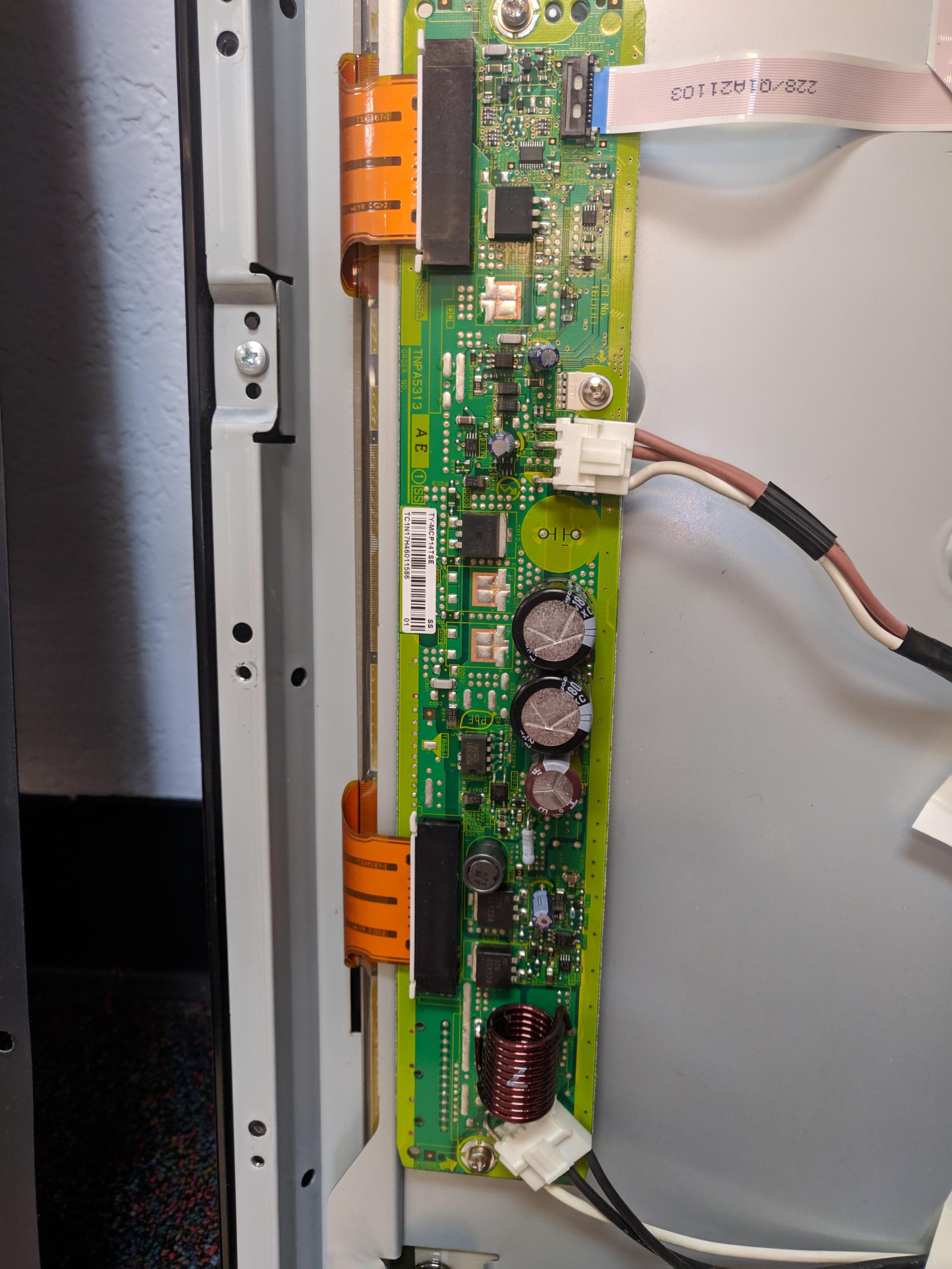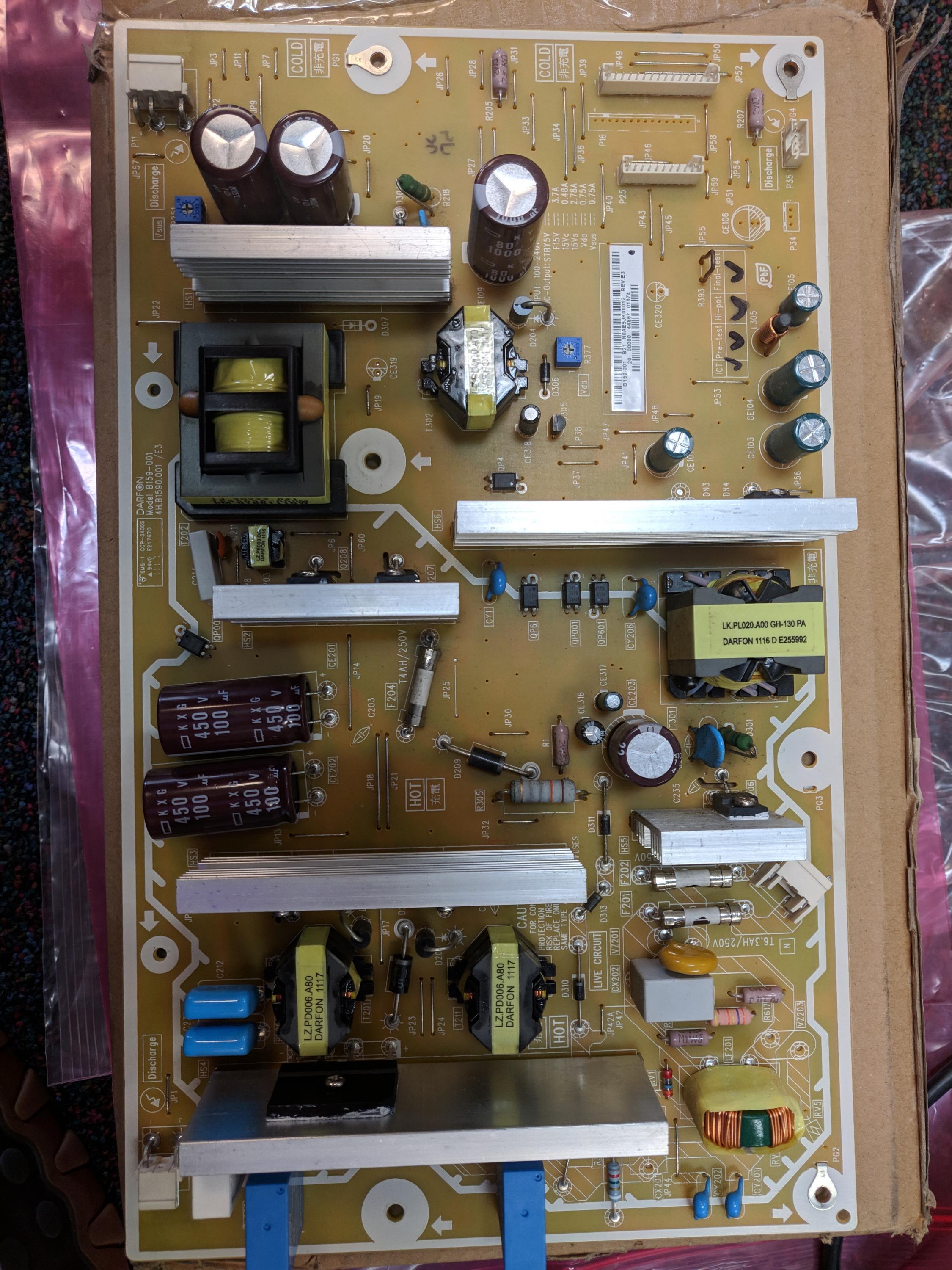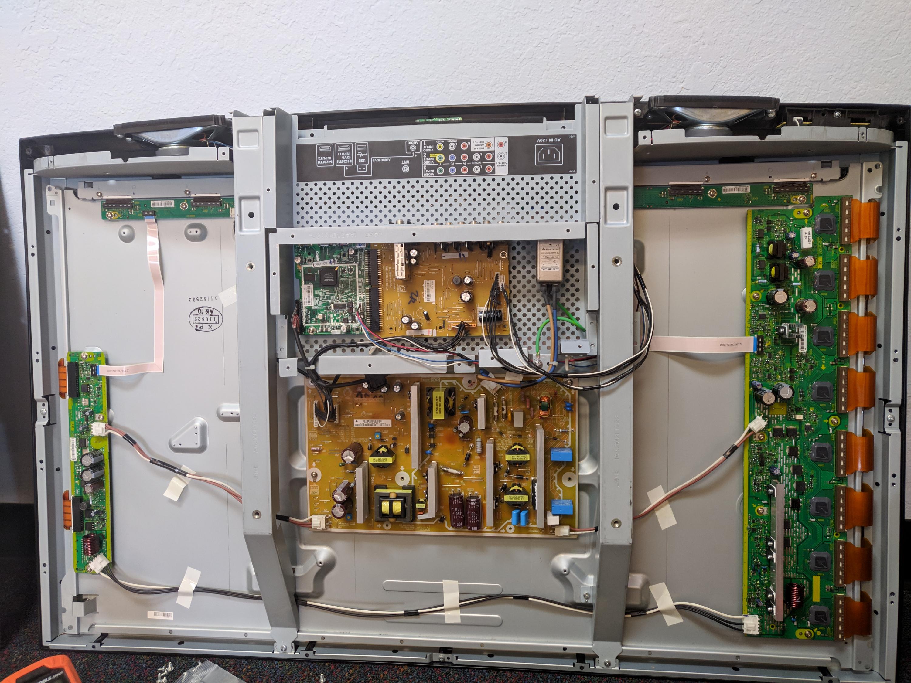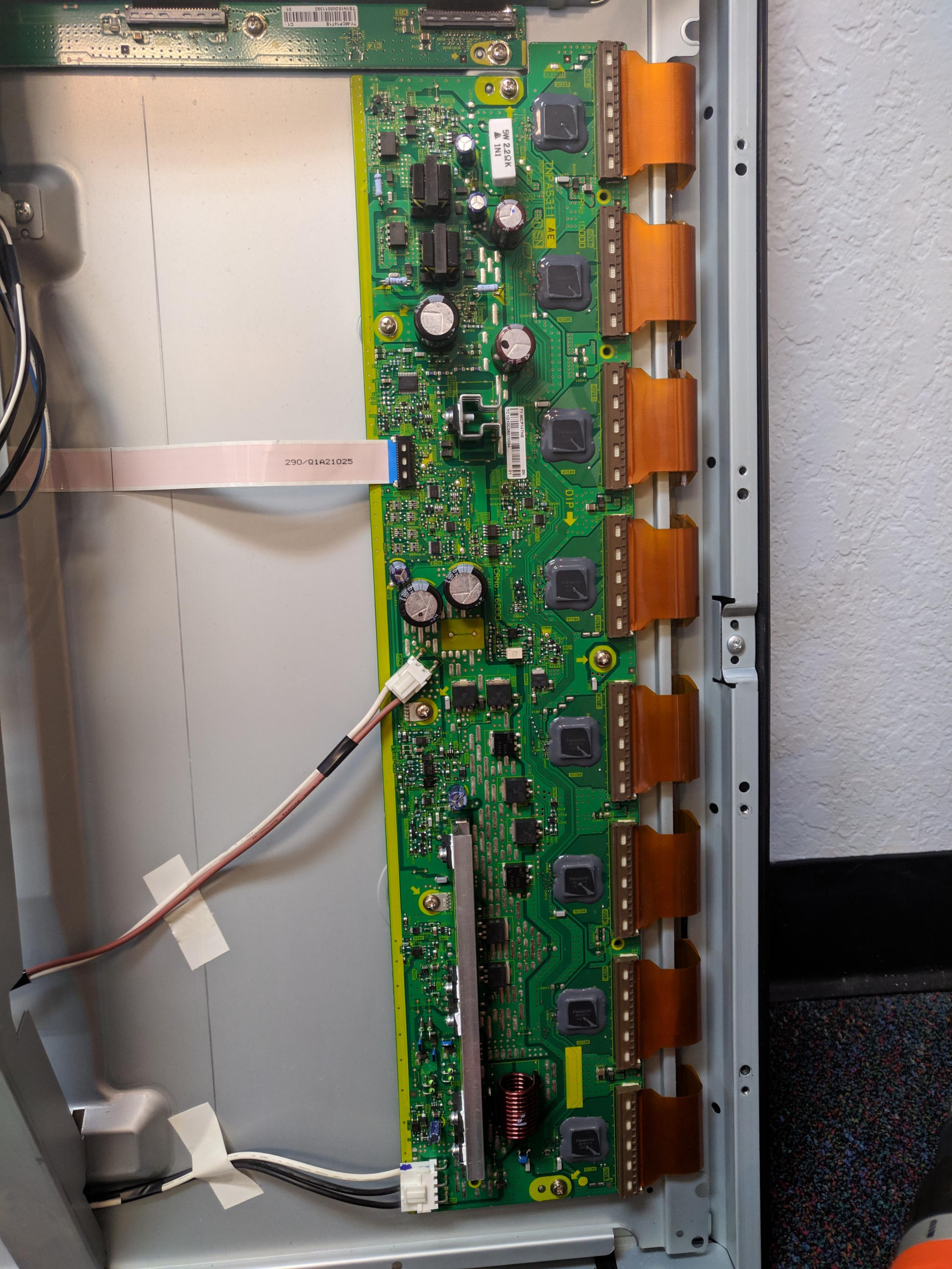 TV original came to me with no power, no LED, no sign of life whatsoever. I took some initial voltage measurements and found the SN board had multiple shorted components on the board and I found a replacement cheap enough so I replaced the SN board. I also bought and installed a repair kit for the main power supply board. Now, the TV shows some signs of life, but it still isn't there yet. I scoured through all of the threads here about this model, but haven't found anything similar to this particular problem. Here is what it is doing now: