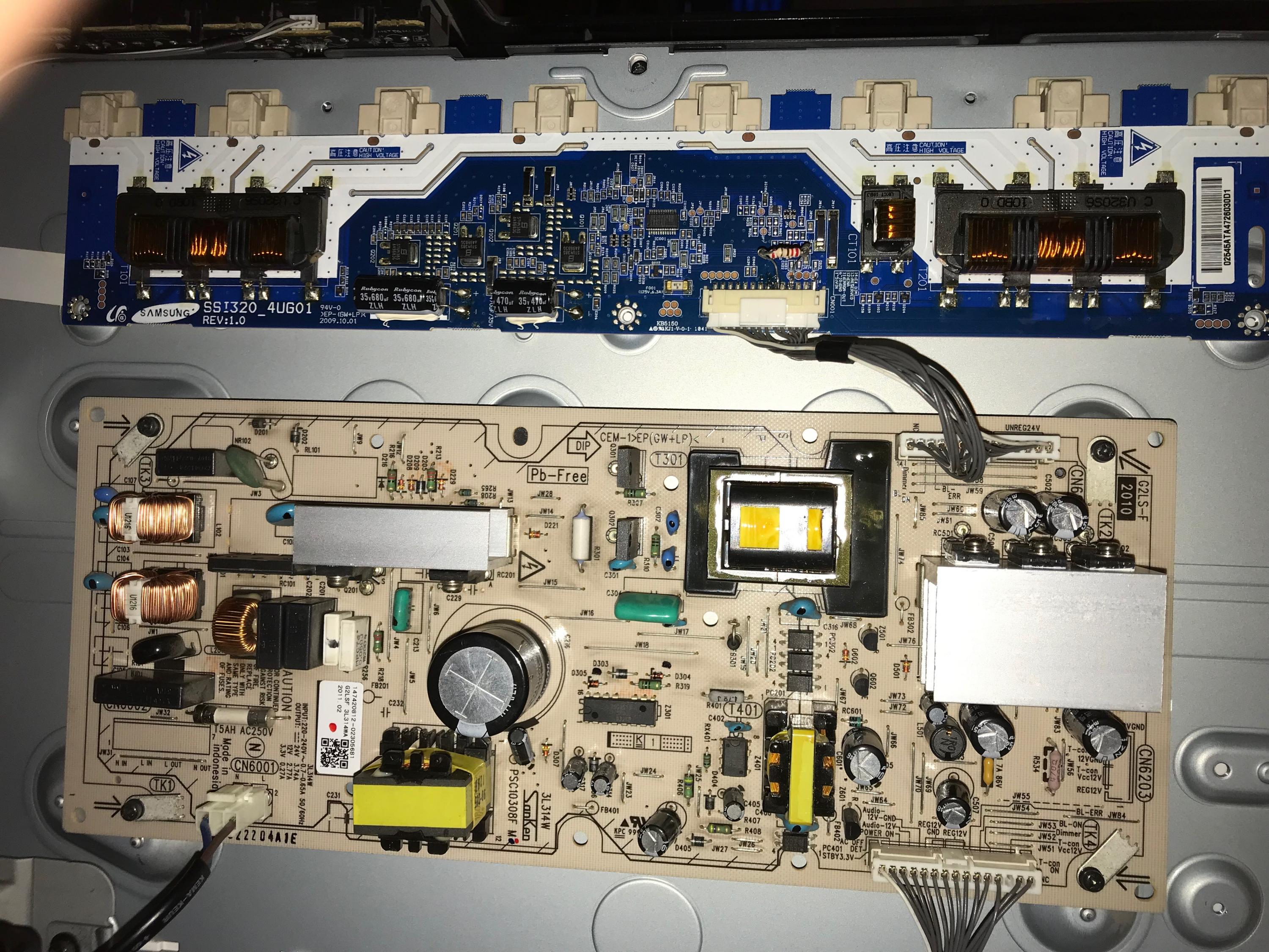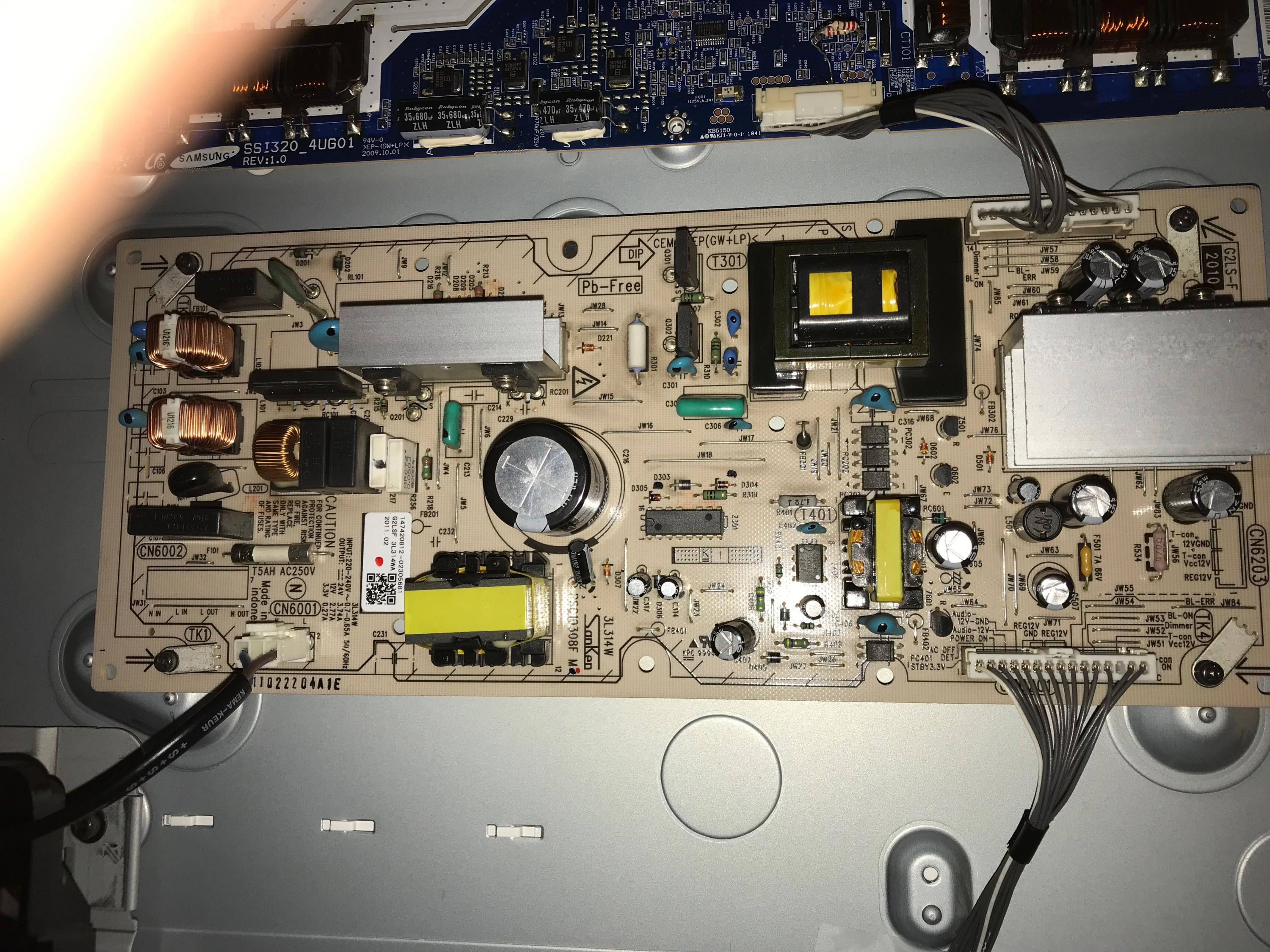Not exactly sure on this model, test fuse on tcon to make sure it isn't blown, there might be a test point on tcon close to where the lvds cable plugs in, should be around 12 volts.