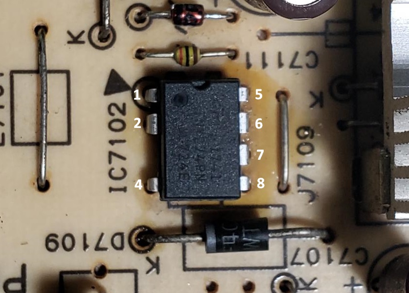 See attached photo for IC7102 Pinout with measured voltages. Using HOT ground. All DC.