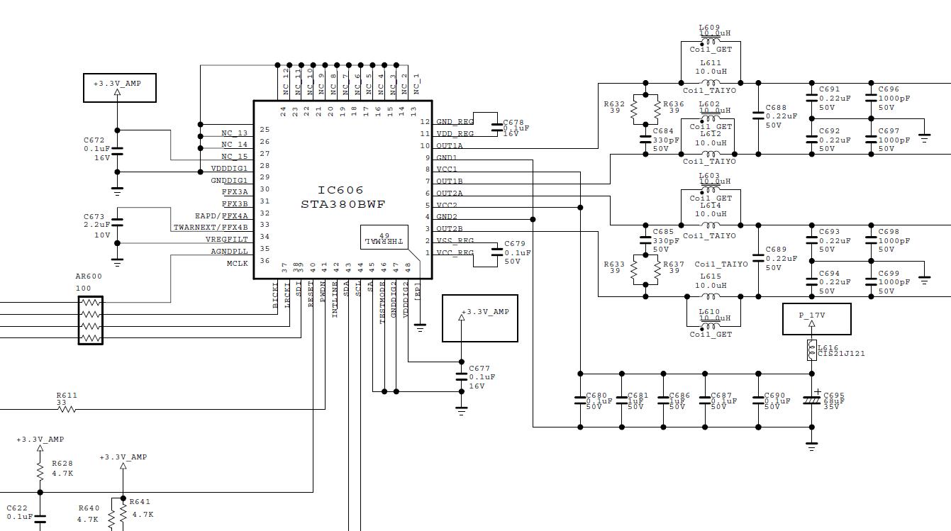 That would be the audio output ic. (STA380BWF), If it is killing one of the voltages you might be able to disable it and see if the rest of the tv works. If the 3.3 volts is being killed, trace that pin and there should be a small smd coilyou could remove to disable the ic, same goes for the P_17v
