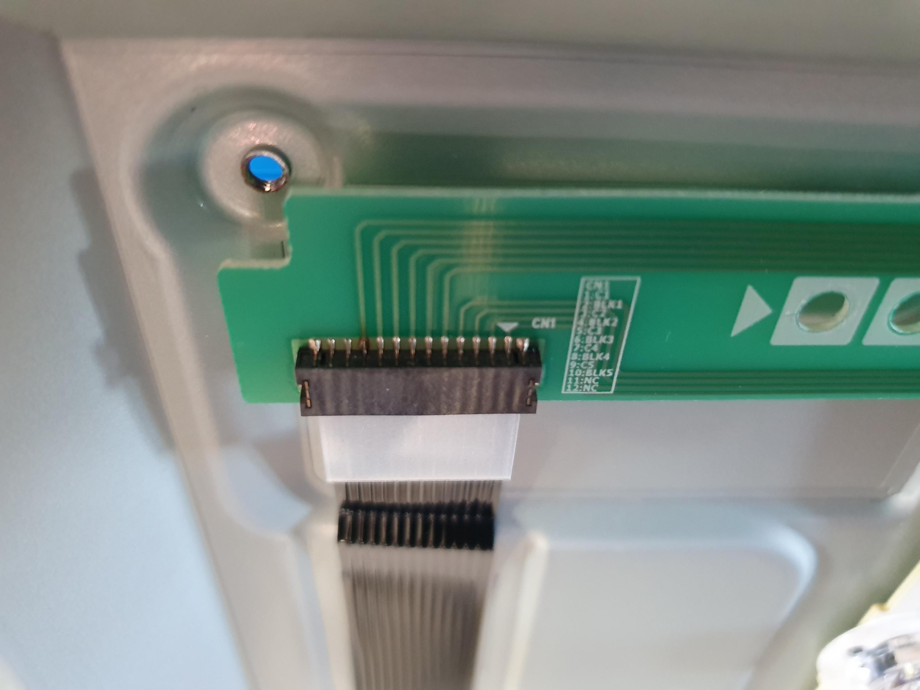 After watching some youtube videos and checking some forums, I'm at a loss. With both ribbon cables connected, we have no image. With the left one pulled out, the screen is black and white, split down the middle. With the right cable removed, it is all black. Backlight is working fine and we have sound and can open applications. We are strapped for money right now and are hoping to repair whatever the issue may be. I think the TV was manufactured in 2012, so I'm aware that may not be possible. Edit: Found a single vertical line of blue pixels on the left side of the screen with one of the ribbon...