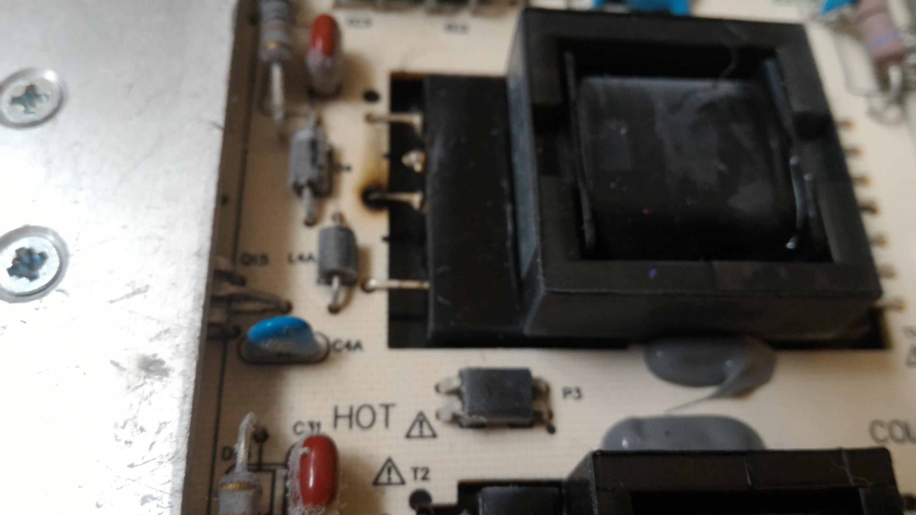 Inside, the only odd thing that l've noticed is a spot on the power supply board looks toasted. This is where one wire from the transformer joins the board.