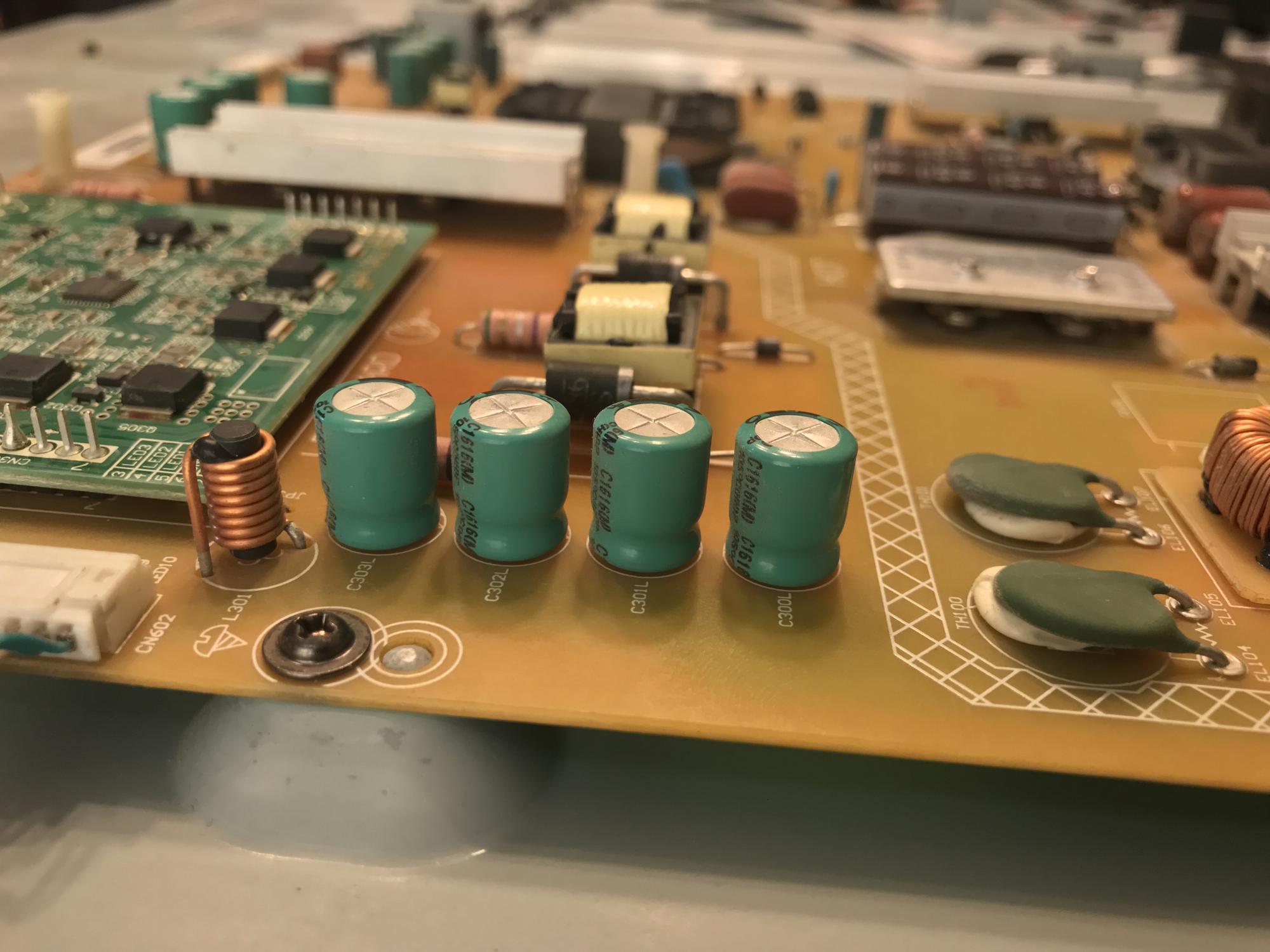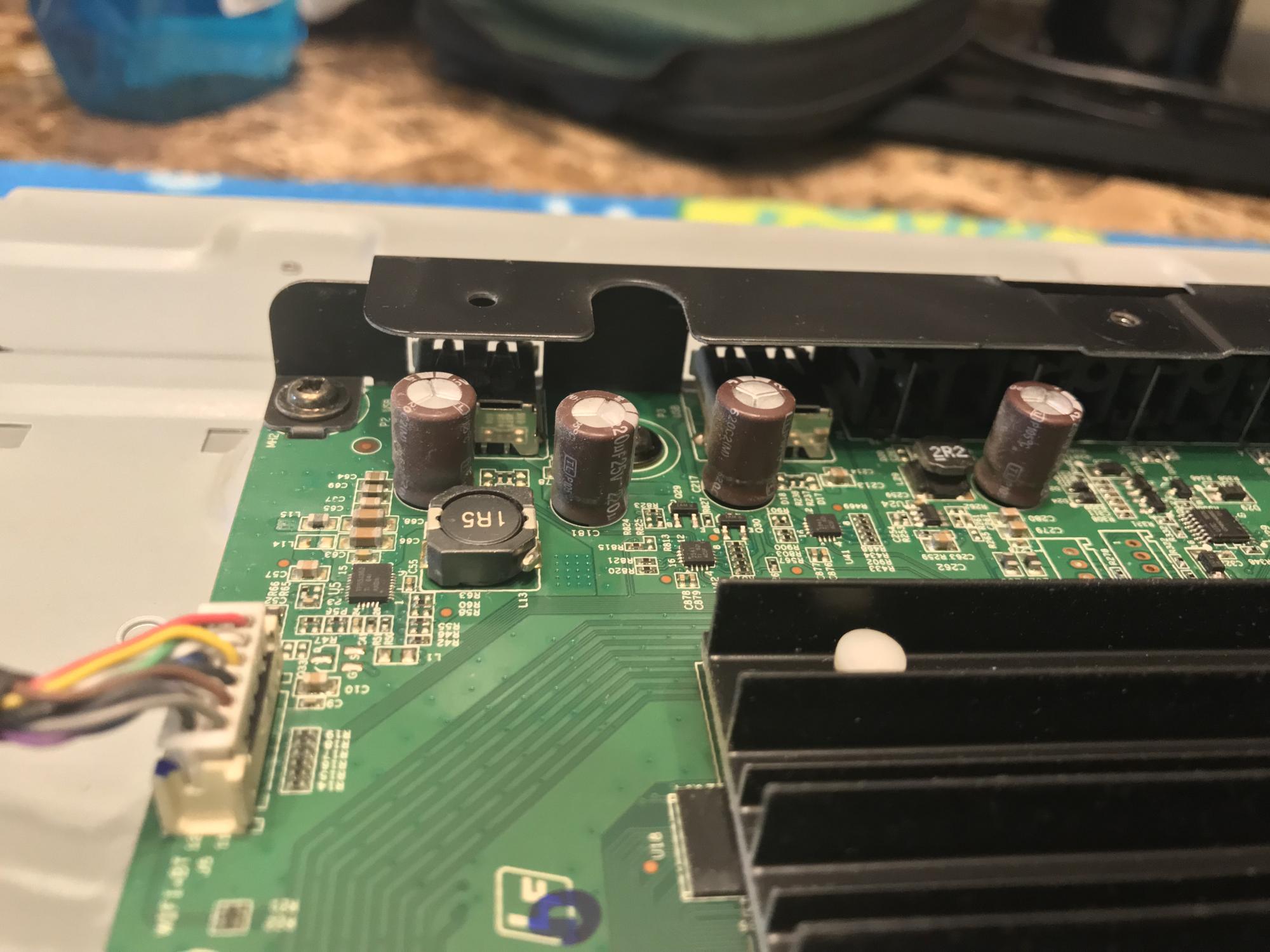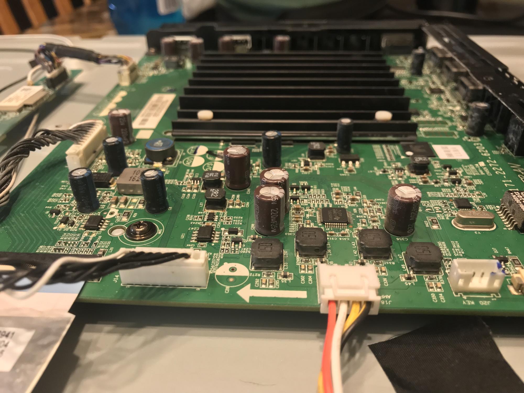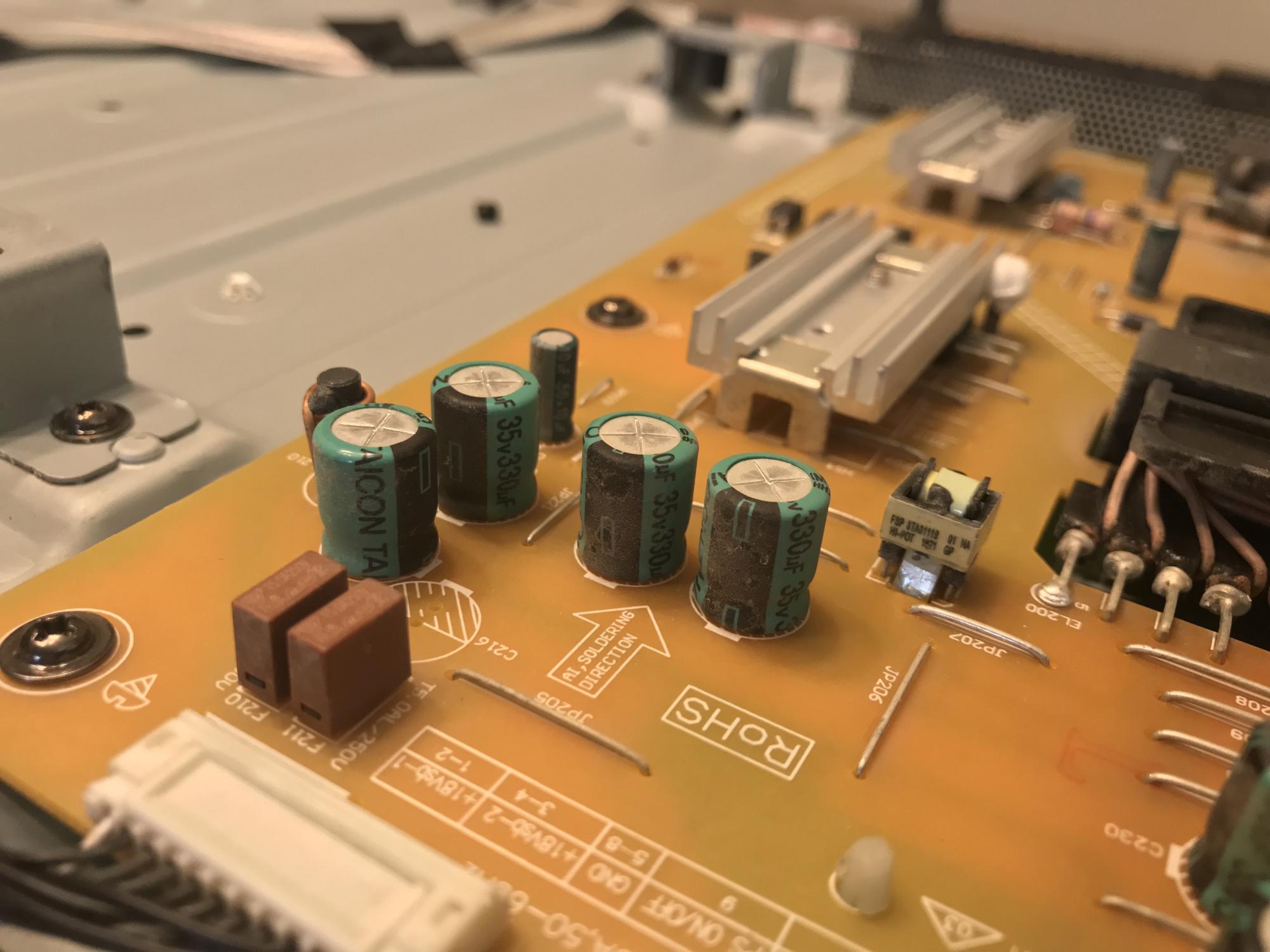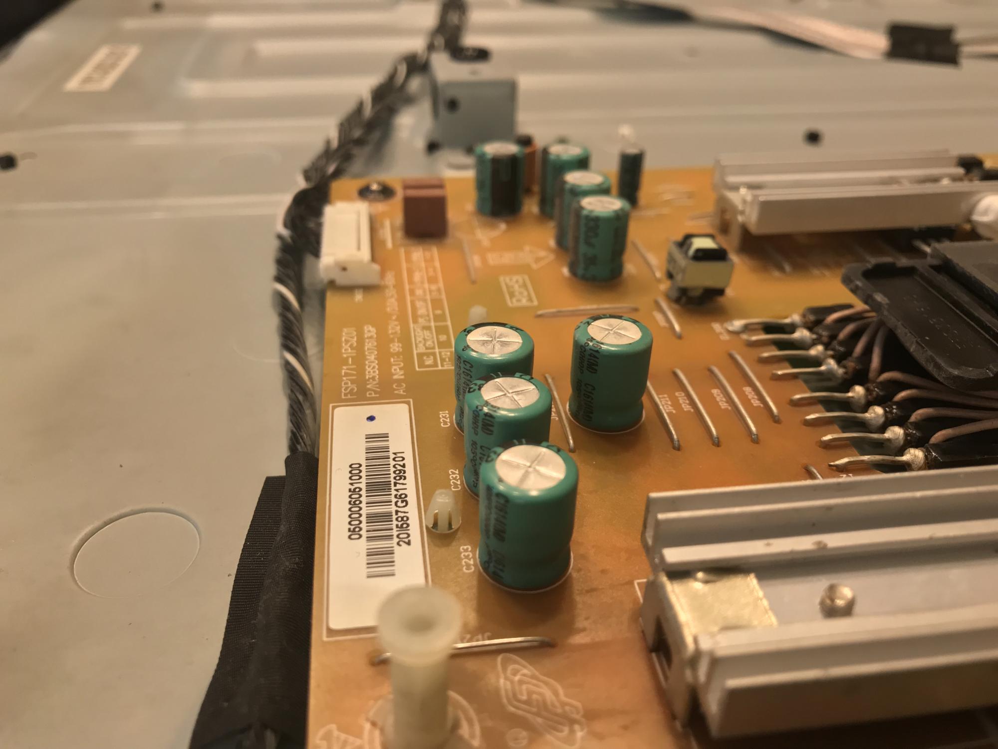 by Super360Ok so here's the story. I was watching tv one day when all of a sudden I heard a pop from the back of the tv set and rushed to unplug the set. By this time the tv already had smoke coming out the back. It was not storming or inclement weather that day to cause a power surge to the best of my abilities. When I opened the tv up, I found that the three capacitors on the psu (highlighted in red) were all bulging and looked they had exploded. I replaced all of them right away and when I went to start up the tv after the "fix" it started just showing the flashing vizio logo as soon as power...