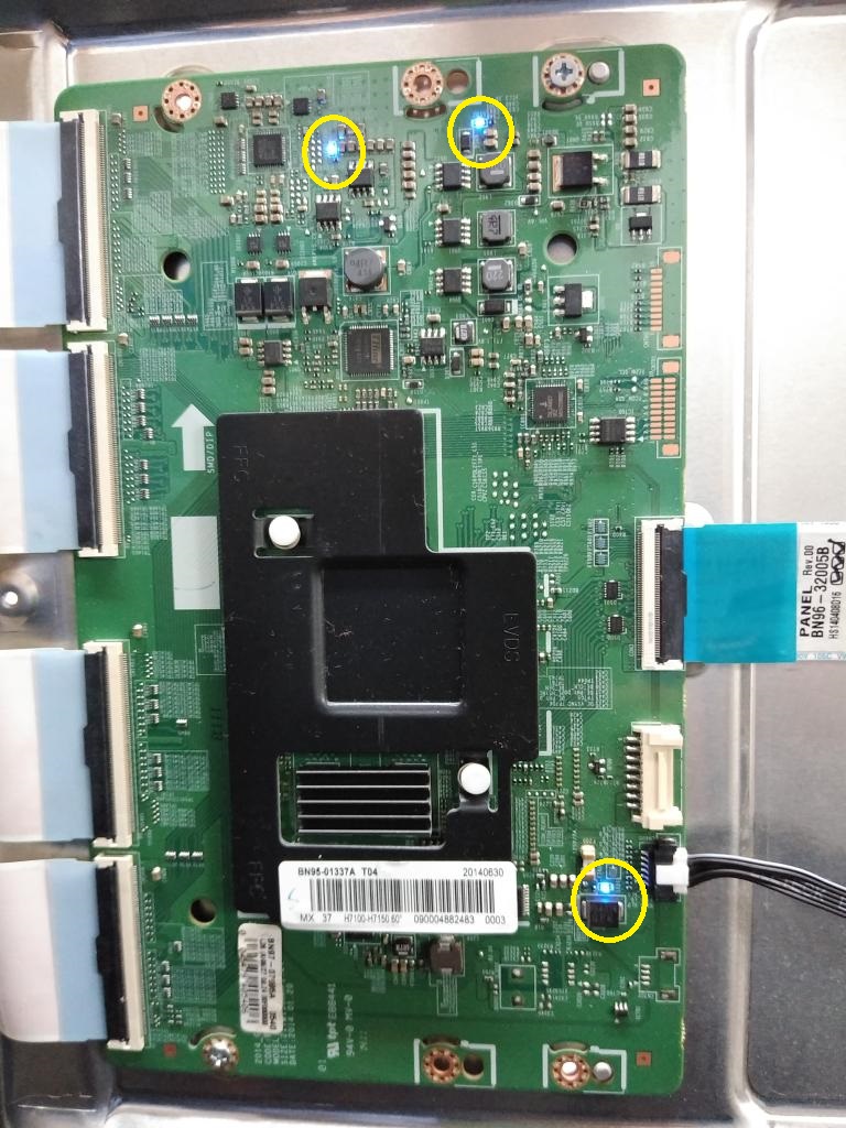 I noticed the T-con board has 3 LED's; LED-1 comes on / off with the TV being turned 'on' / 'off'. LED-2 blinks one time real fast when the TV is turned on. LED-3 has never come since I took the back off. I don't know if that helps or means anything!