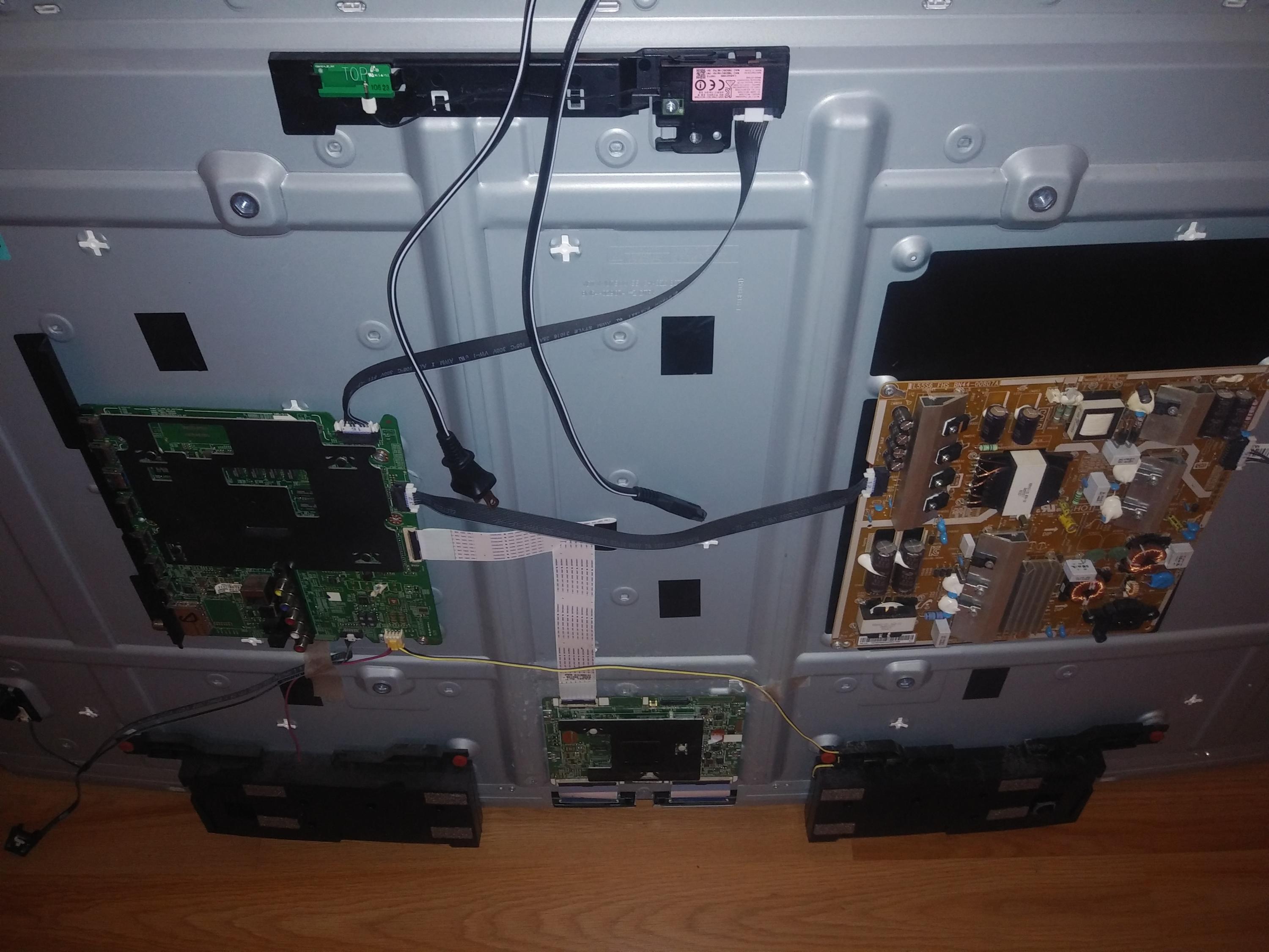I have a Samsung un55ju6700 that will turn on with a picture for about 2 minutes, then I get a green screen. Next I hear some clicking on one of the boards then the backlights shut off. If I disconnect the LVDS cable from the t-con, the backlights stay on with no problem. I tried disconnecting the panel then connecting the t-con to see if backlights stay on. Backlights shut off anytime t-con is put into the circuit whether or not the panel is connected. Anyone have a similar problem?