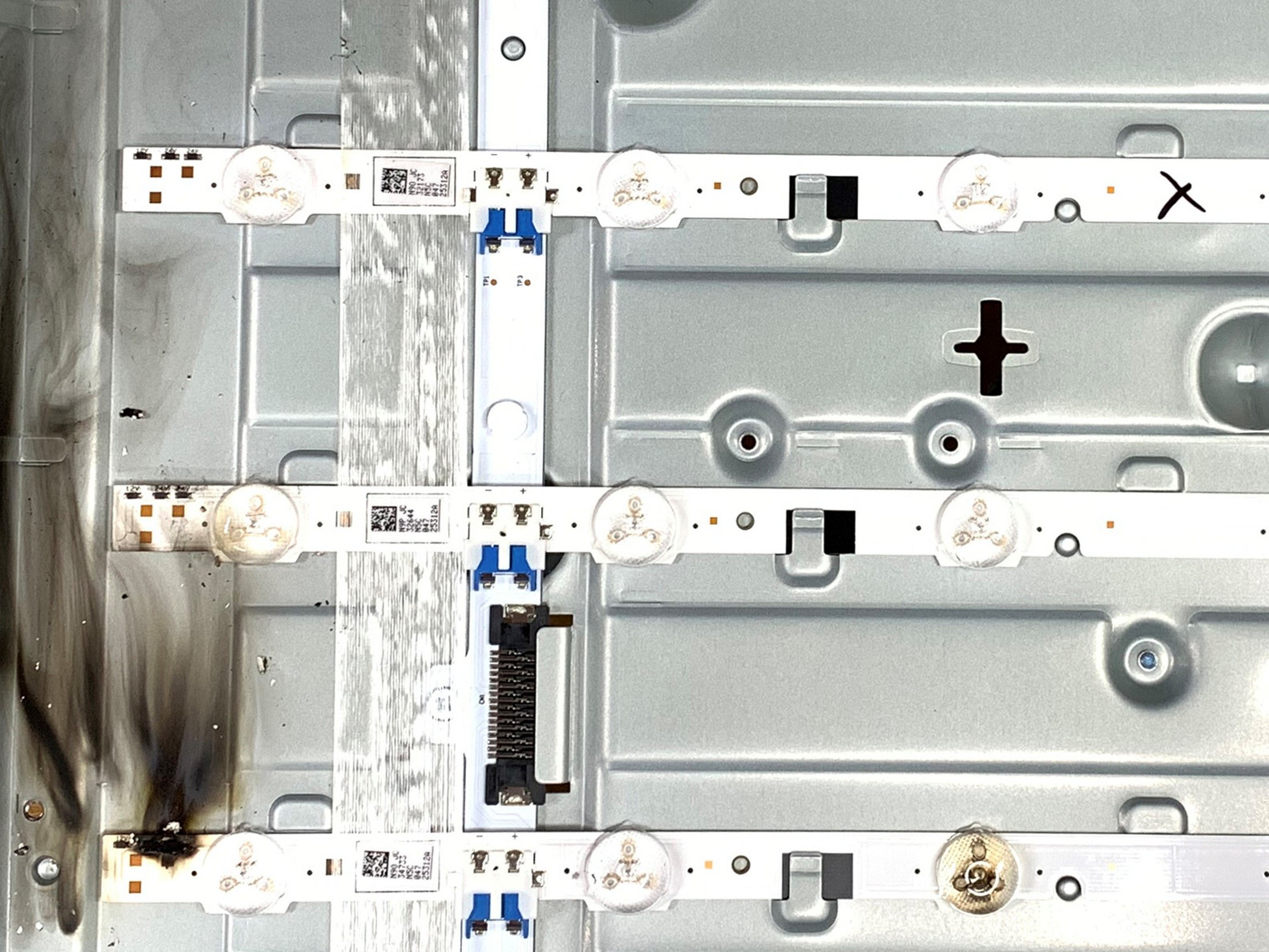 I disassembled it and found some scorched components on one of the backlight strips. There are also components on other strips that appear to have been overheated, with discoloration showing through the mounting tape.