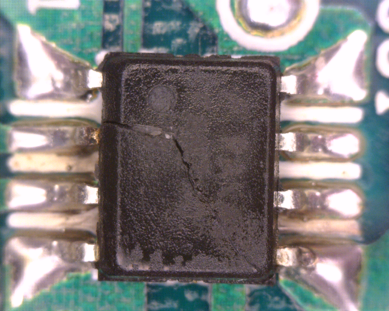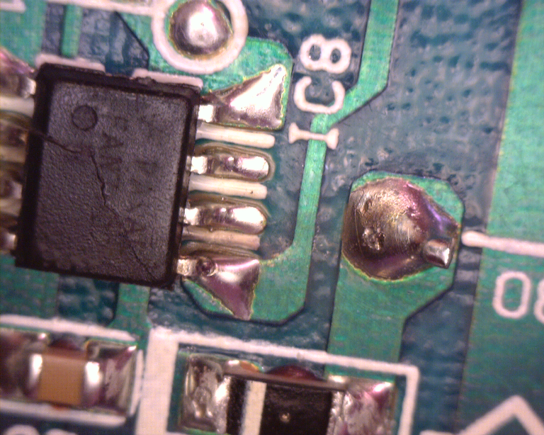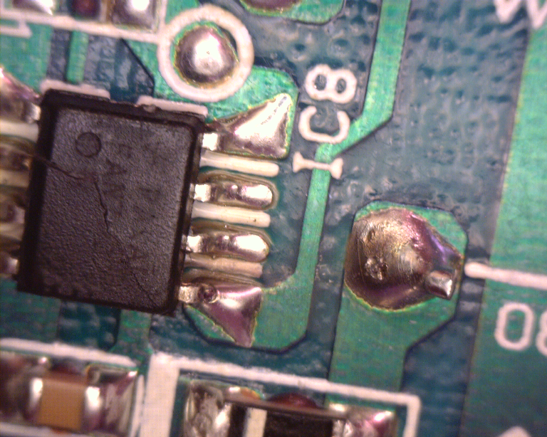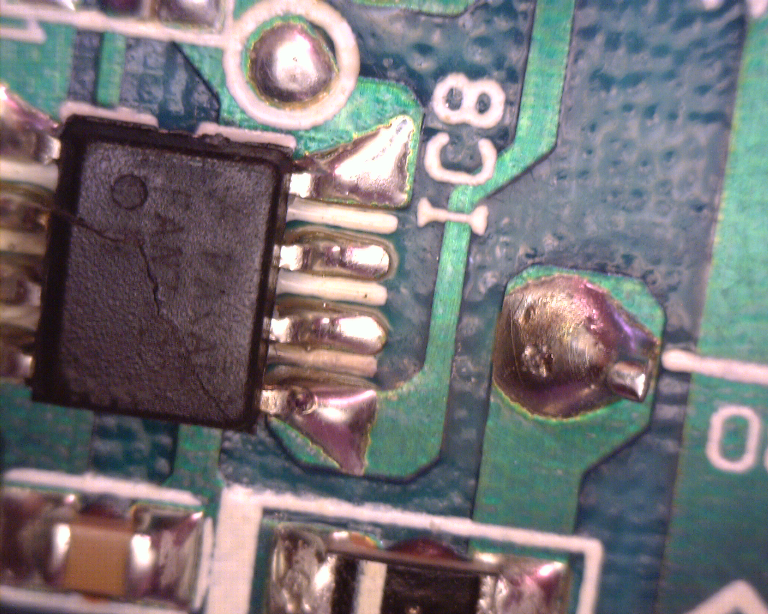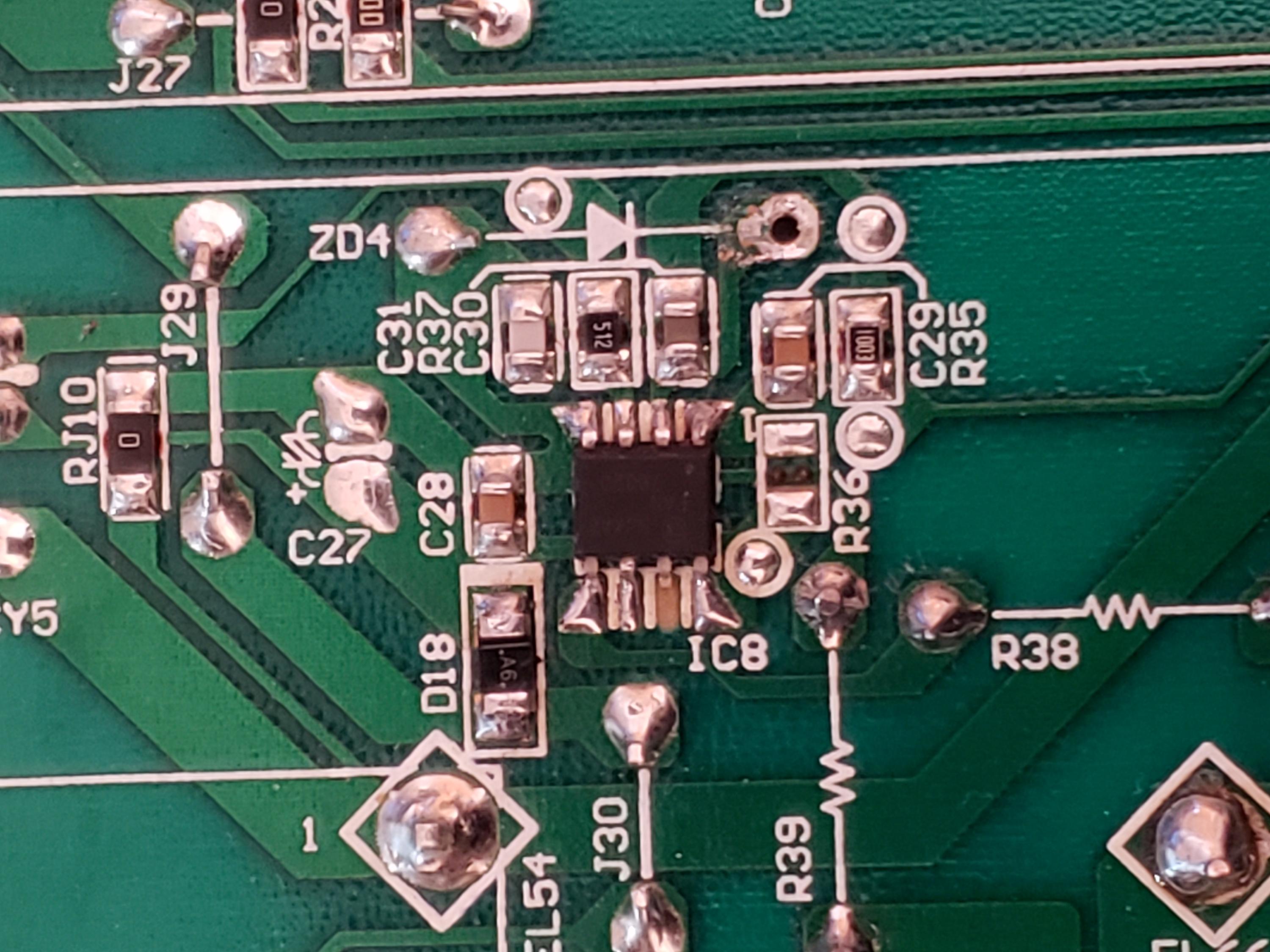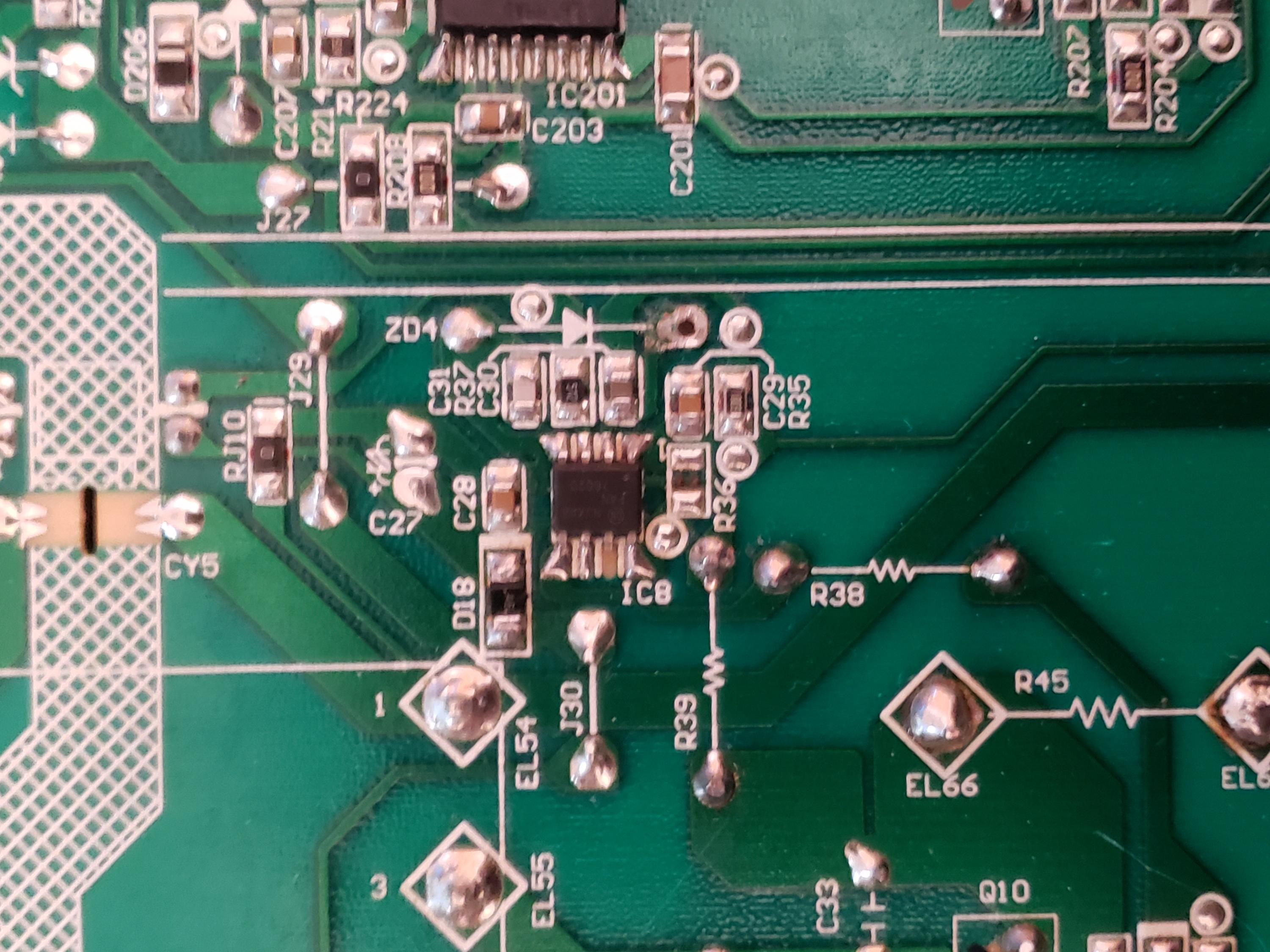 Remove the baord and inspect the parts on the other side where ic8 is located.