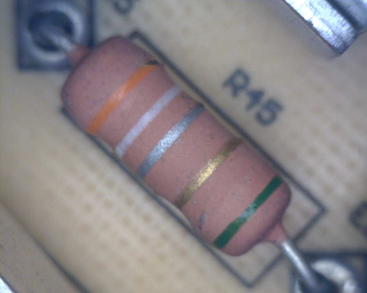 R45: Band 1 Orange, Band 2: White, Band 3 (silver must be gray) and Band 4 is gold and band 5 is green: 39.8 Ohm 0.5% Tol?