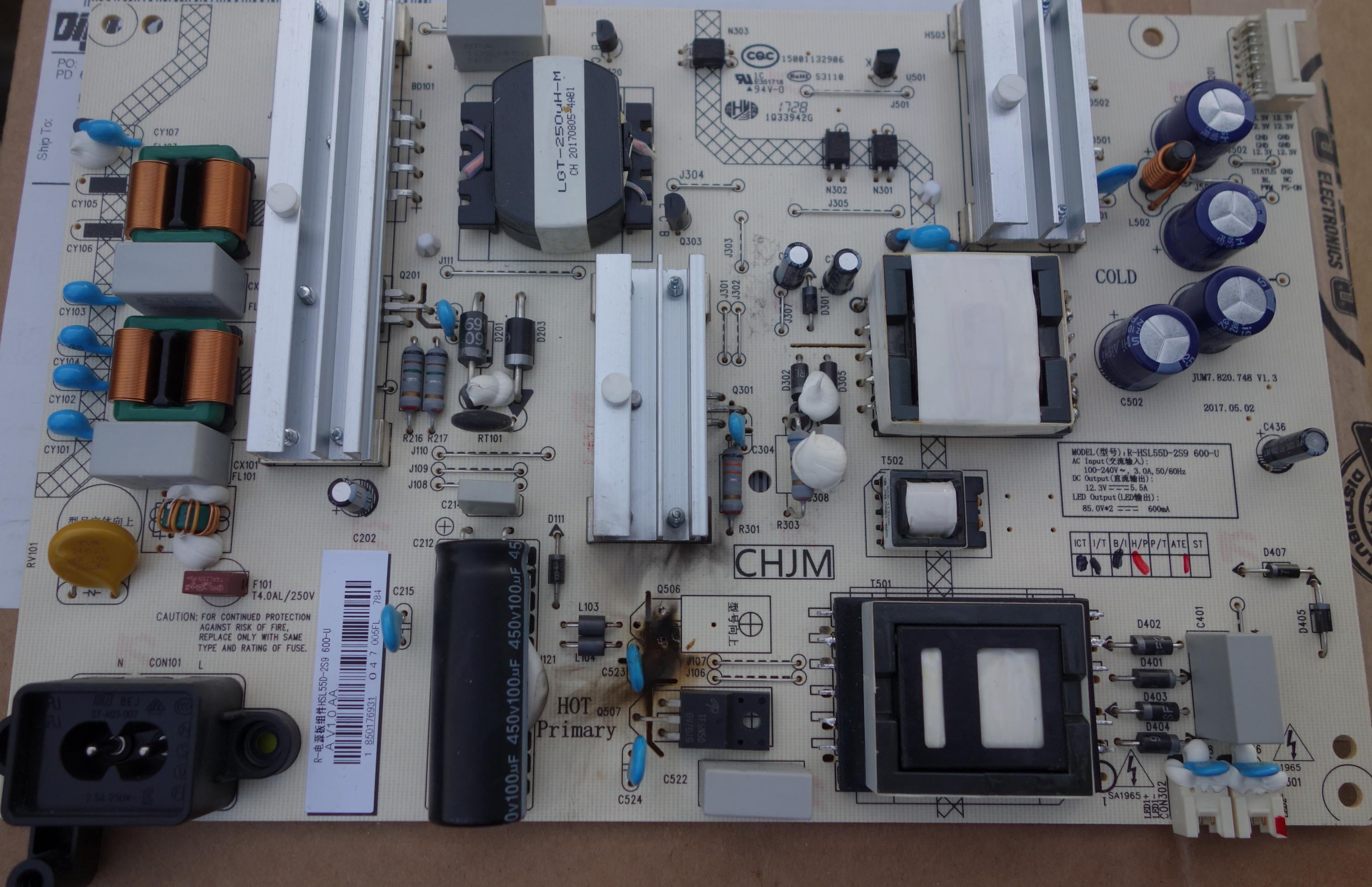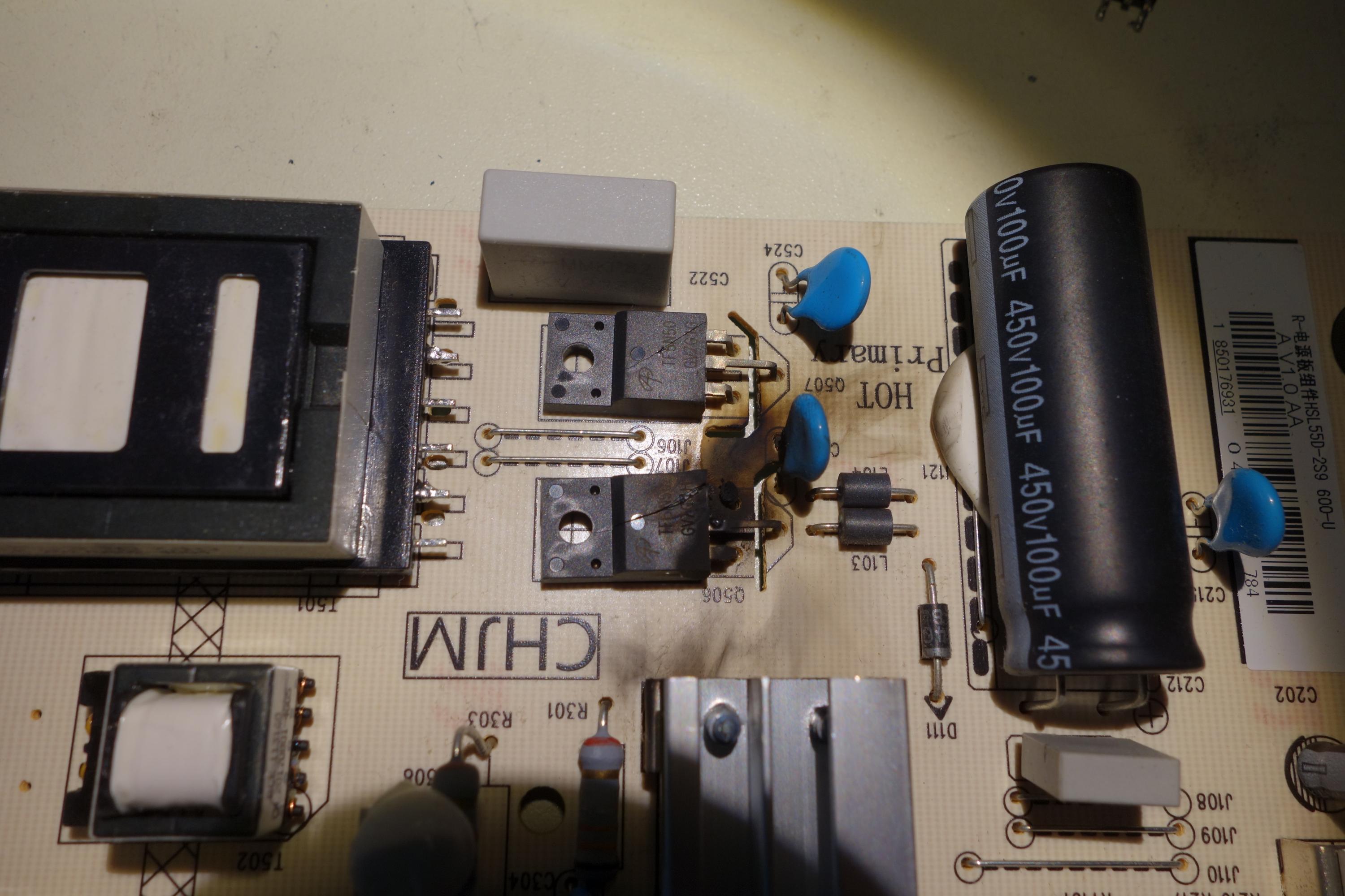 Owner reported he had it diagnosed as bad backlights. US model number may be RTRU5027. Checking the backlight connectors with an LED tester, the two wire pairs had the same voltage. After opening up the tv, all the leds tested fine. Then I noticed the burnt FET on the power supply board. Source pin was blown out. There are two on the hot side (not heatsinked) and they look mirrored but most of the components on the burnt side seem damaged. I can match the resistors but the SOT23 transistor is suspect and the diode is bad and can't read the markings on both. Power supply board is HSL55D-2S9 and a bit expensive for a used one.