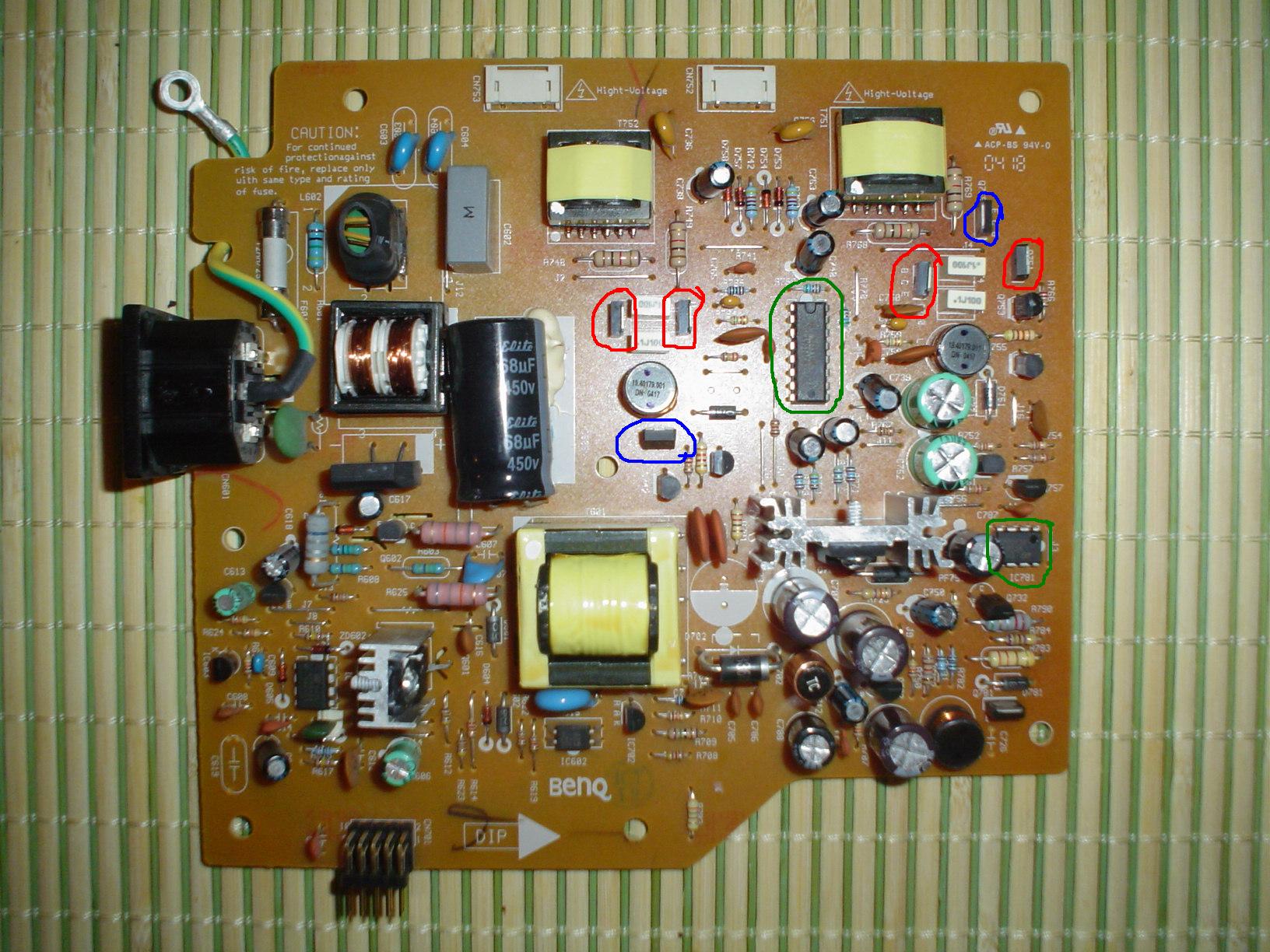 The inverter circuit on this board looks similar to the one used on the E172FBb, but the layout is different. I have attached an edited version of the picture. 4 transistors have been circled in red. They should all have the same part number, C5707. 2 transistors have been circled in blue. They should have the same part number, FU9024N. Check these transistors for shorts. I have also circled two ICs in green. What are the part number of these ICs.