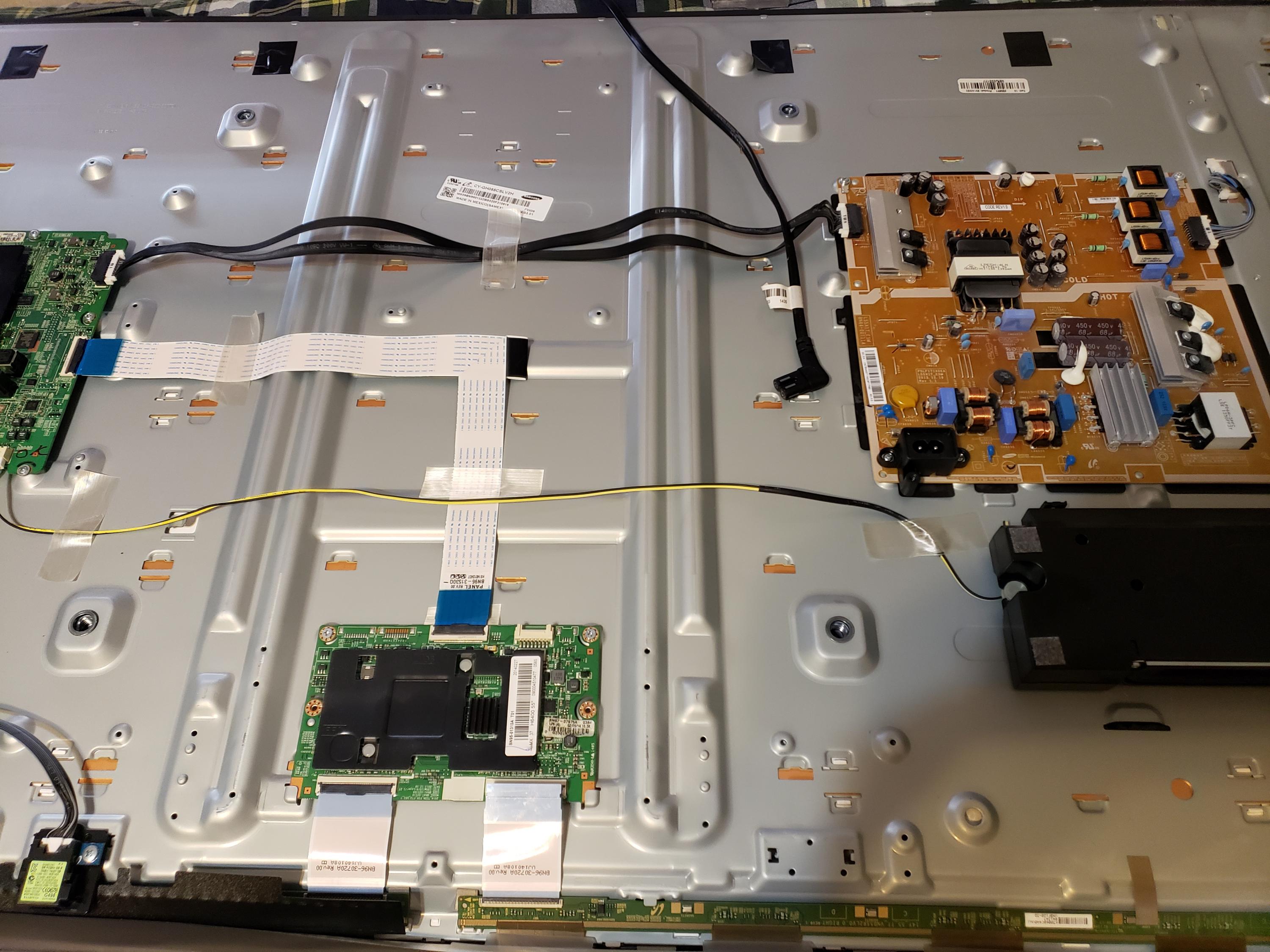 A co-worker gave me a 55-inch Samsung TV model UN55MU6103F so I can try to fix the following problem... As soon as I plug it in to the wall, the TV turns on, and the display shows a few stripes all over the screen. I took off the back cover and disconnected both ribbon cables that go to the display (one at a time) so by doing that I can narrow down the bad section of the problem, but in both cases the display turns black. I know there are some voltages that I have to check (VGH, VGL, etc.) but don't know what reading each has to show. If anyone could guide me on this,...