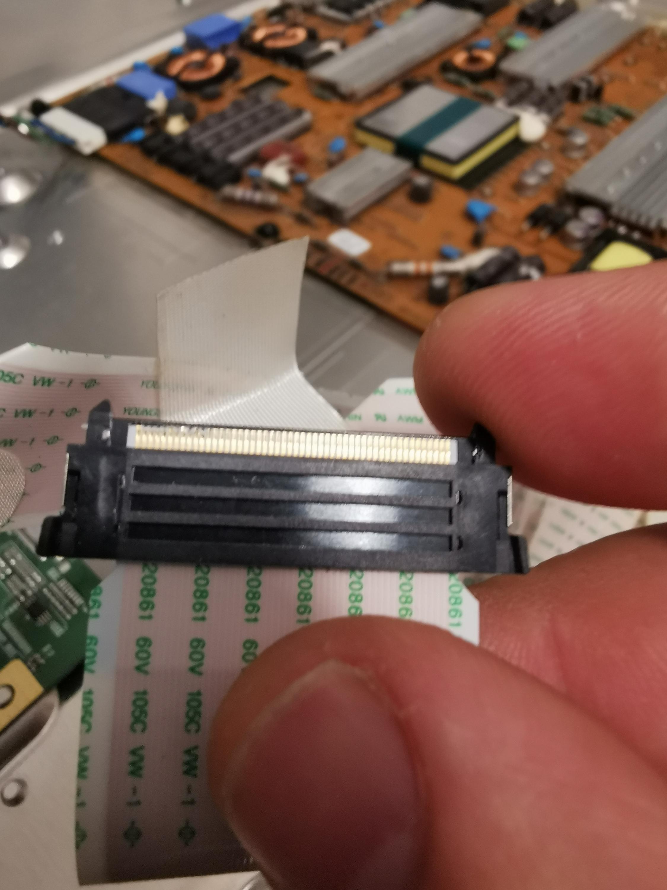 BUT there is another problem. There is a green horizontal line on the left part on the screen, not visible on black picture. I've cleaned the ribbon cables with a rubber and a brush, but that didn't fix the problem. One of the ends of the ribbon cable has few lines (i don't know if this is the correct term) looking kind of strange but appear to be making contact with the boards.