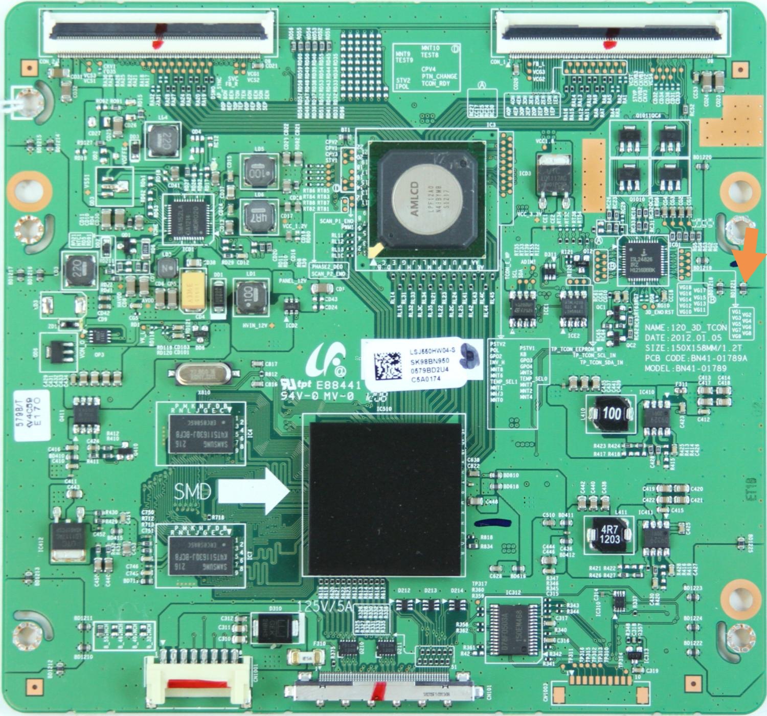 - Jumpered FB_TRDY_1 (pin 1 CN1300 left. main tcon->left side buffer boards) and FB_TRDY_3 (pin 95 CN1301 right. main tcon->right side buffer boards) This allows testing individual T-Con (on main board) connection to panel on this Samsung. Found fault on left side (viewing from rear of TV)