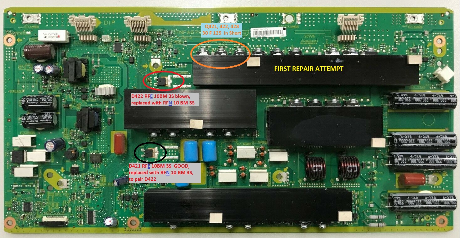 The closest match for diode I found was RFN 10BM 3S, and replaced both D421 and D422. Note "RFN" instead of "RFE", not sure this makes a difference. These diodes I got from a reputable online AU supplier, I trust they are genuine.