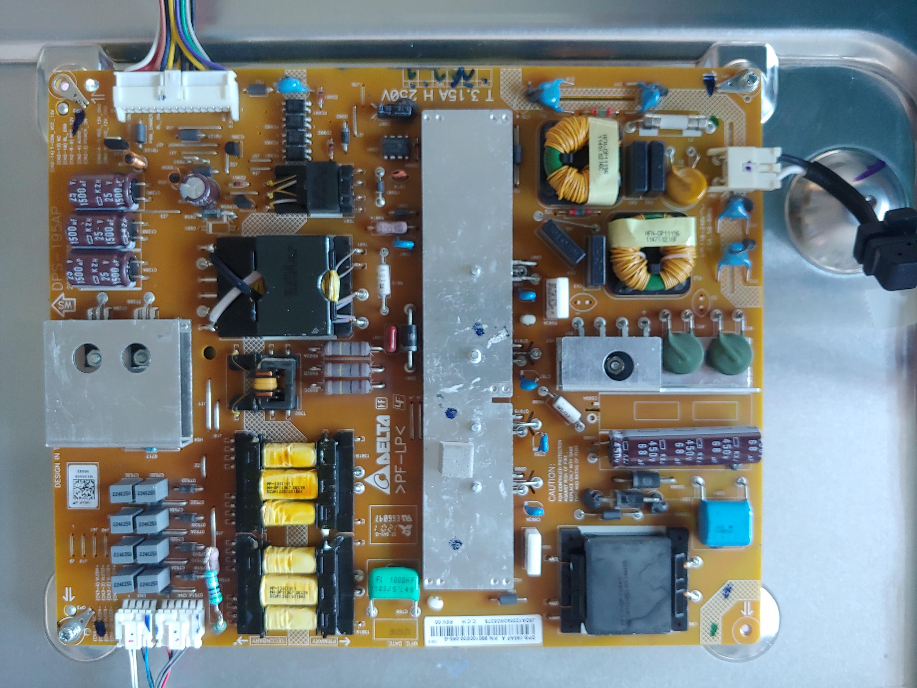 This TV came with a defective LED, I fixed it, now is working but has a high frequency noise. When I touch a transformer leg (the yellow one on the right) the sound decreases.