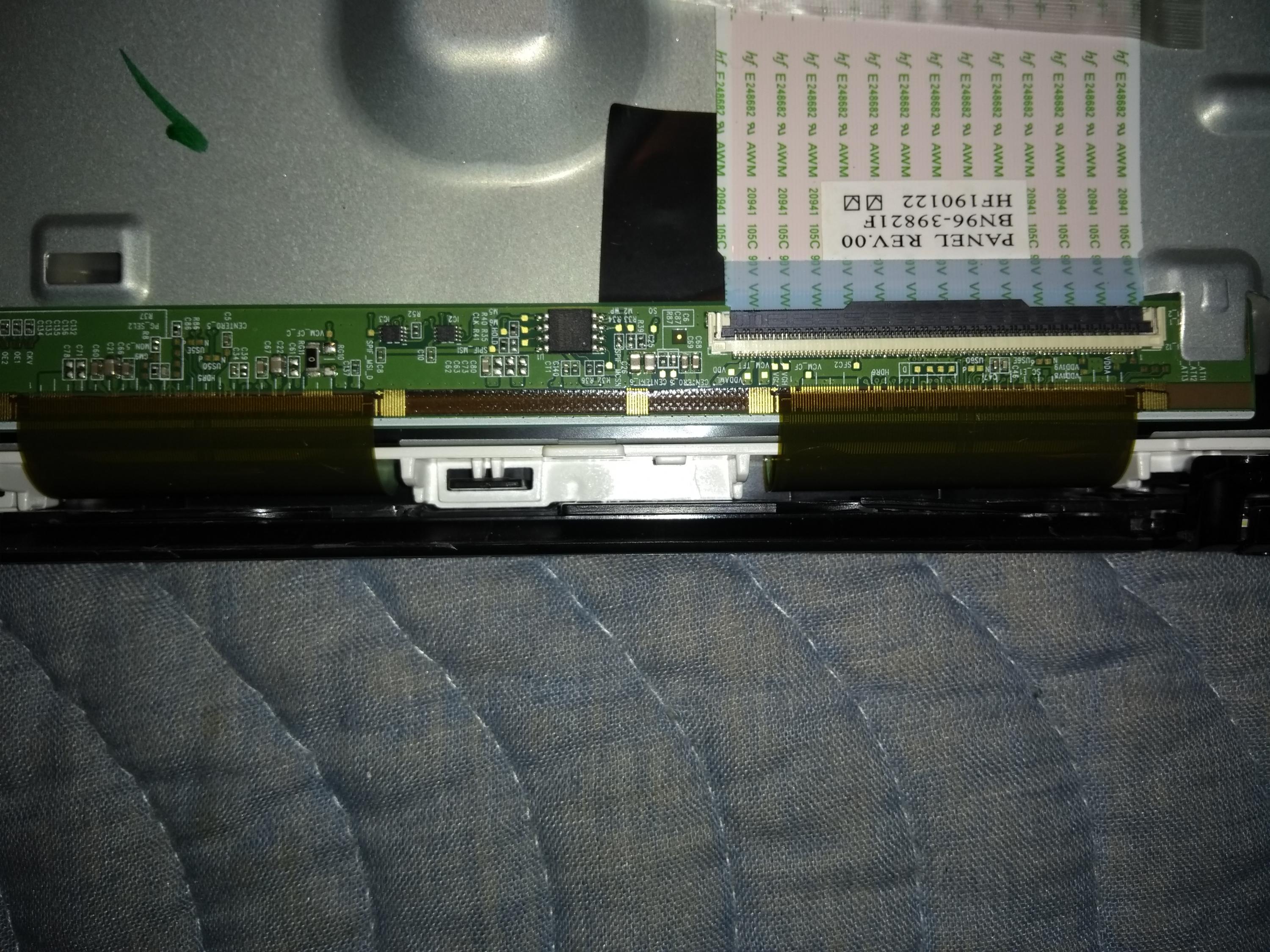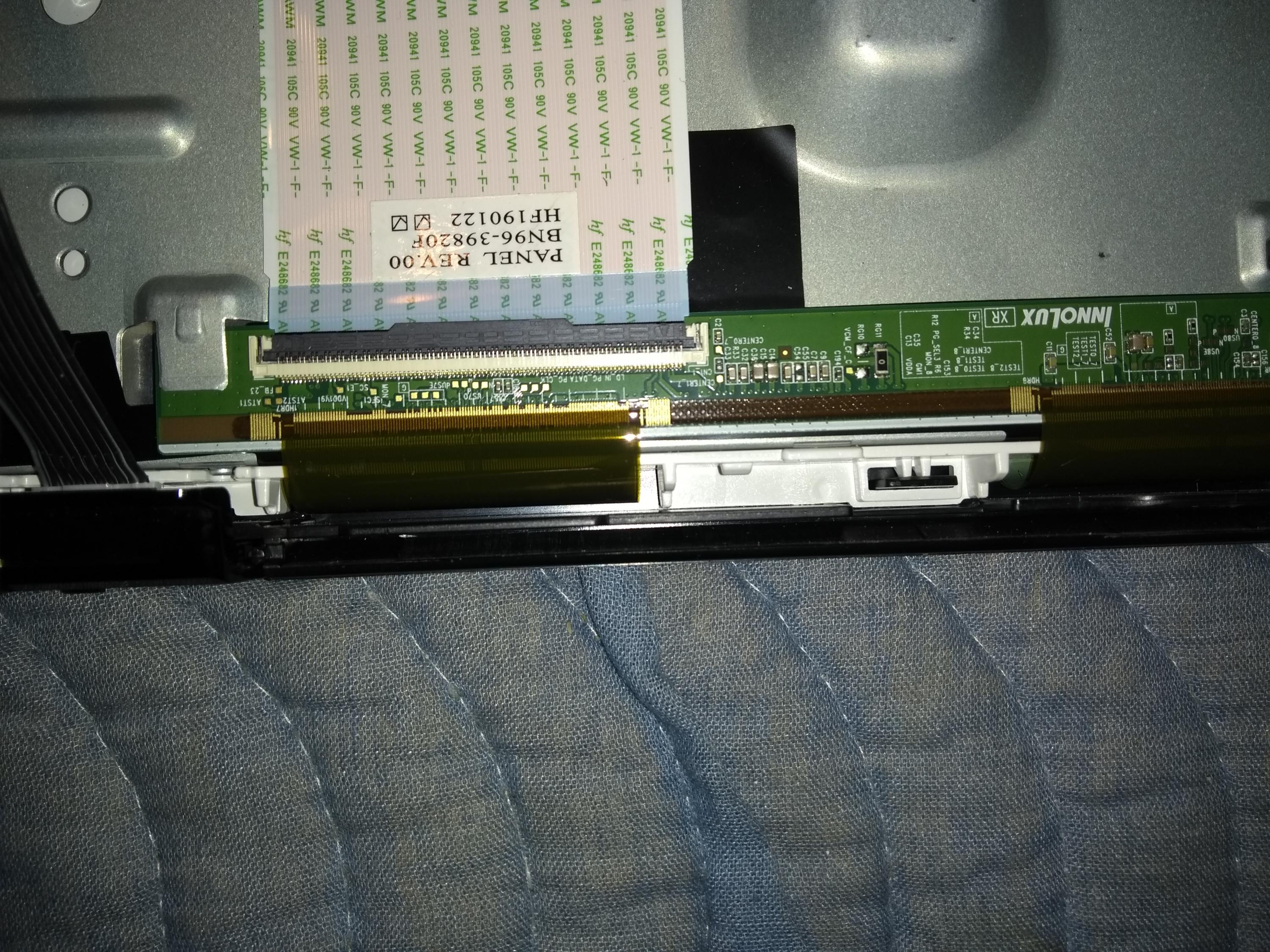 There are several versions of this TV. I have version DA01 and have matched the main board to correct version. I removed the bottom cover where the ribbon cables go down to the panel connections and see no evidence of water intrusion. There is no way to replace the two small boards in there as they are tab bonded to the panel and can find no fuses on them.
