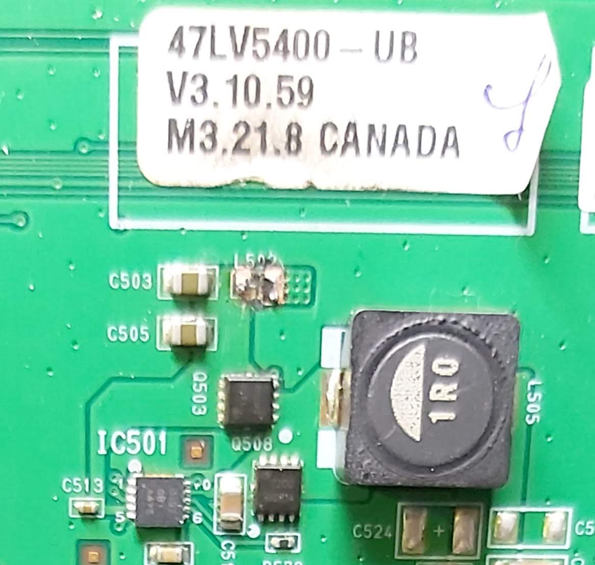 I'm not ready to troubleshoot this board yet because there is a visible component failure. L502 blew! Can anyone tell me the value of this inductor? I tried reaching out to the folks who sell the repair kits for this board and they said that component is not a common failure item.