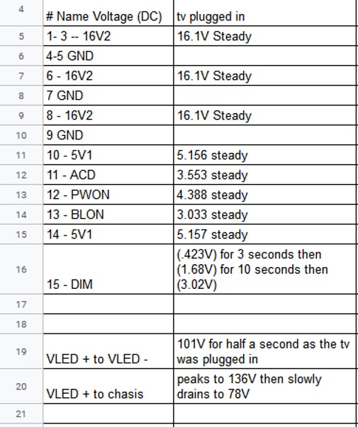 I left the TV unplugged overnight, when I plugged it in again the backlights did turn on for 10-15 seconds then shut off and flashed a 12 red light code. I also got a 5 flash code once but it hasn't returned, the 12 is consistent. I plan on pulling the display off again and rechecking the LEDs, any other troubleshooting help would be much appreciated. I will post my voltages in an attachment.