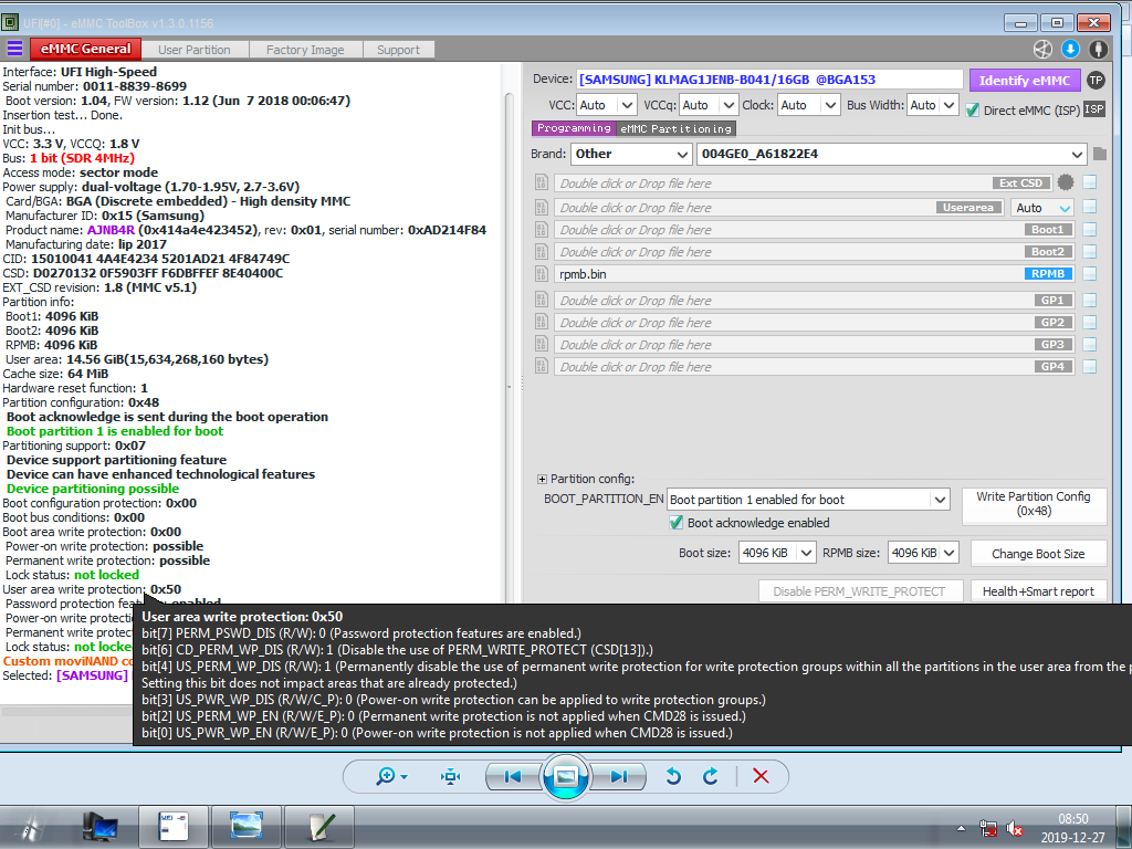 Hi friends .I have this set absolutely death .Power is ok .I have not acces to boot1,boot2 and user via emmc programmer.Programmer logs said - user area protection -0x50 ,I don't know , how disable it.I can read emmc , erase , but can't write.EMMC is KLMAG1ENB B041.Can I disable this protection or I need change emmc?