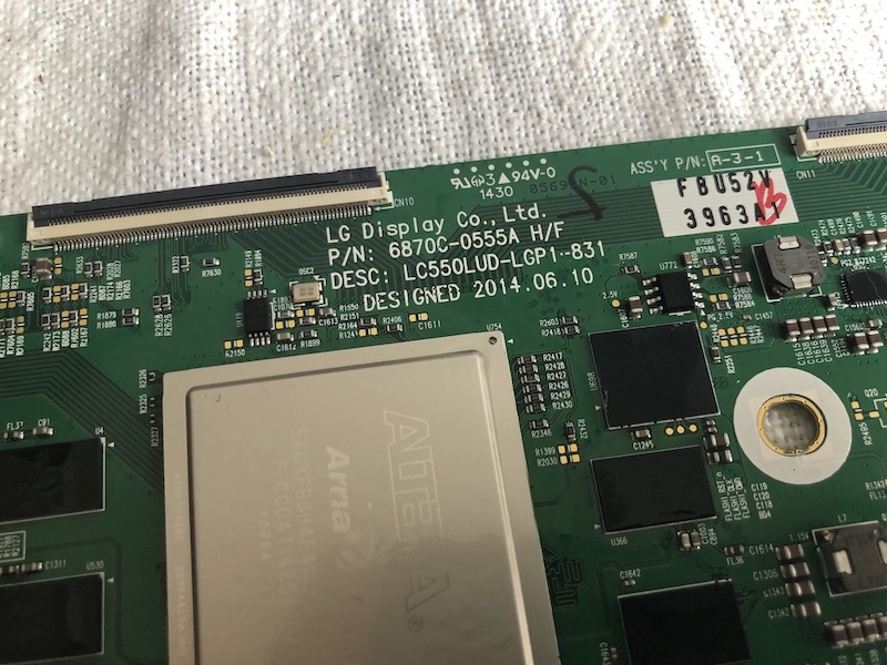Since the TV in background works, it respond to the remote normally, audio works, and after reading similar posts on this forum I understand it can be the TCON board (please help me to understand if it is a defective panel instead) I found two part numbers for this TV, one, the oldest version (6/2014) have a FPGA chip, the second one (11/2014) seems to have a custom chip instead.