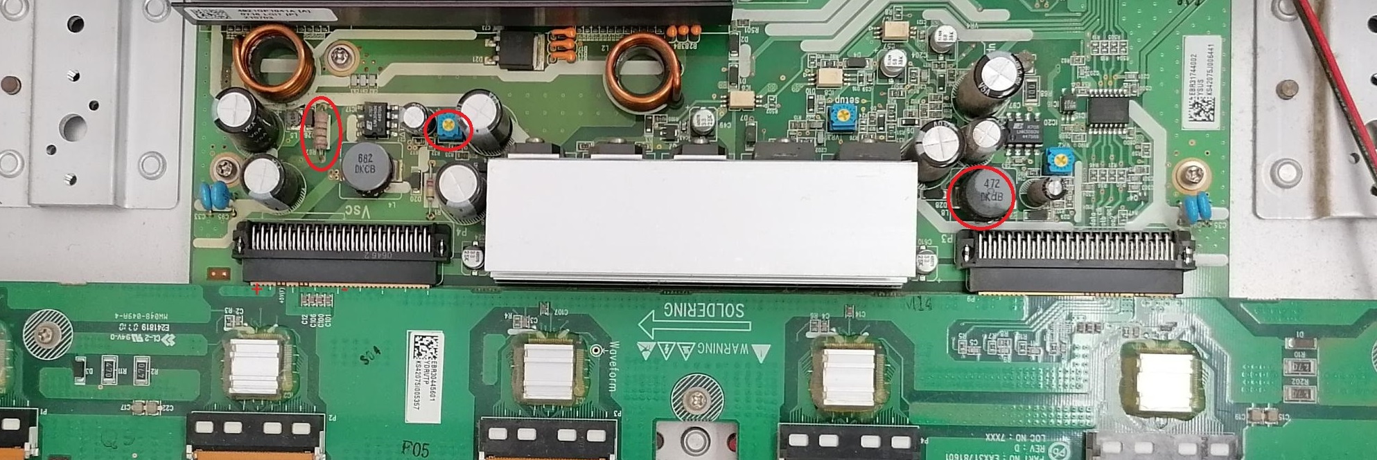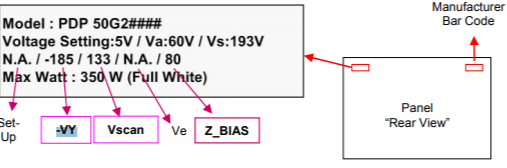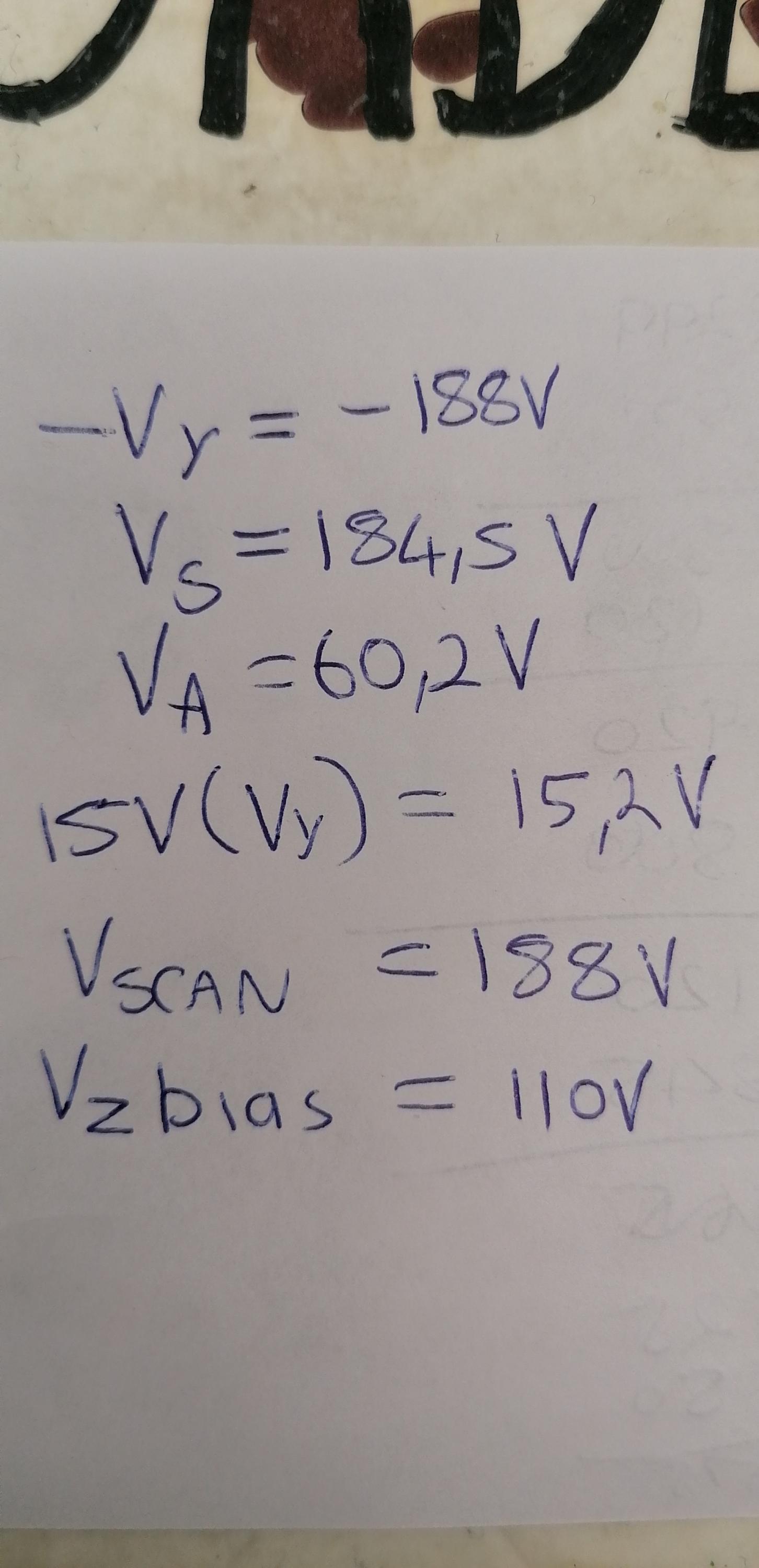 If i pull the AC mains plug i get an image on the screen. It's the exact image that is being auto generated by the logic board and then the tv dies off as power drains. I think the image is the for about 0.2 seconds before disappearing. I wrote down the voltages that i could find on the board but i don't know... on the sticker which label is for which voltage. Can anybody clear up for me the what the sticker indicates, the format of Vscan, Vy Vbias etc....