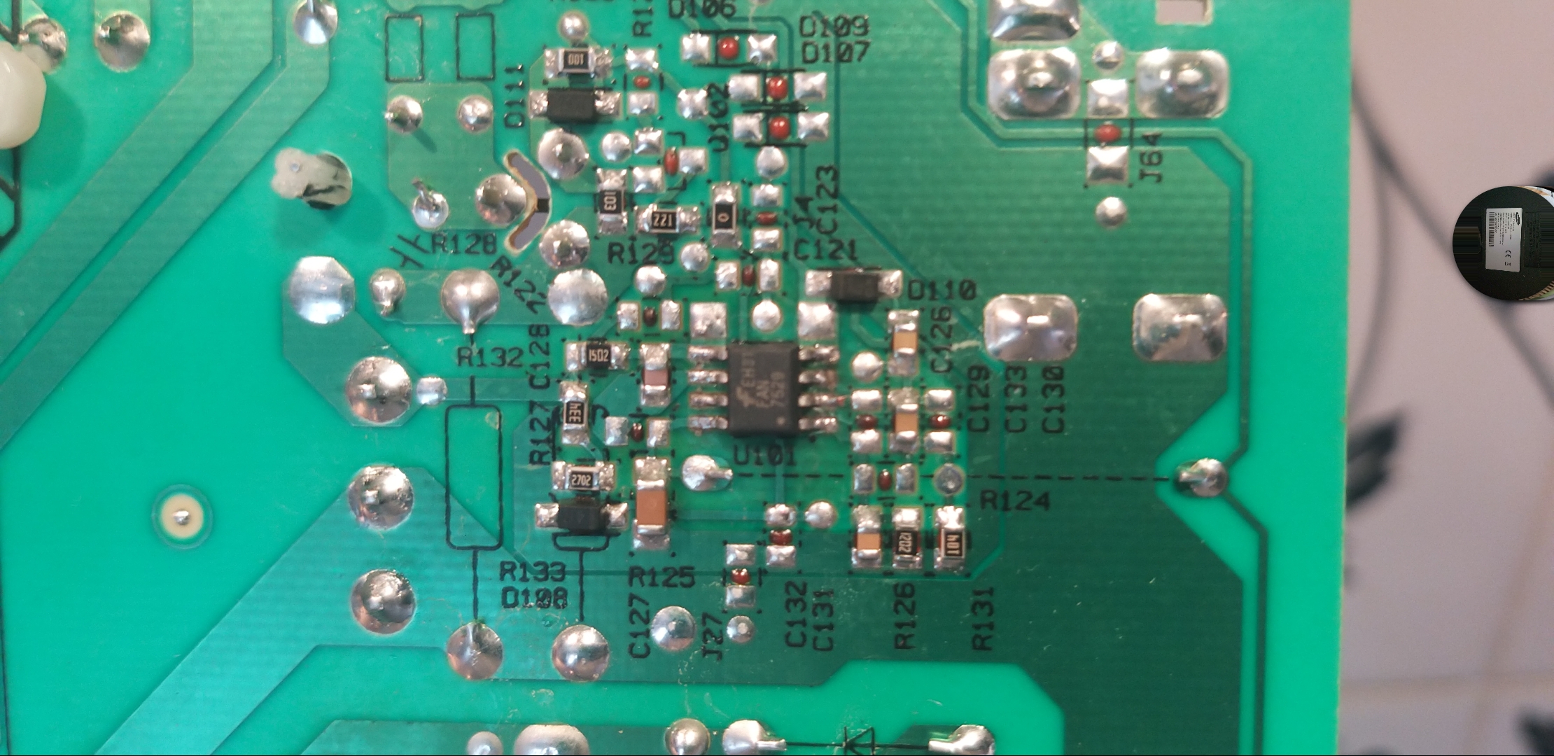 U101, the PFC controller is attempting to boost the incoming DC voltage but because VCC is unstable the boost voltage is also unstable.