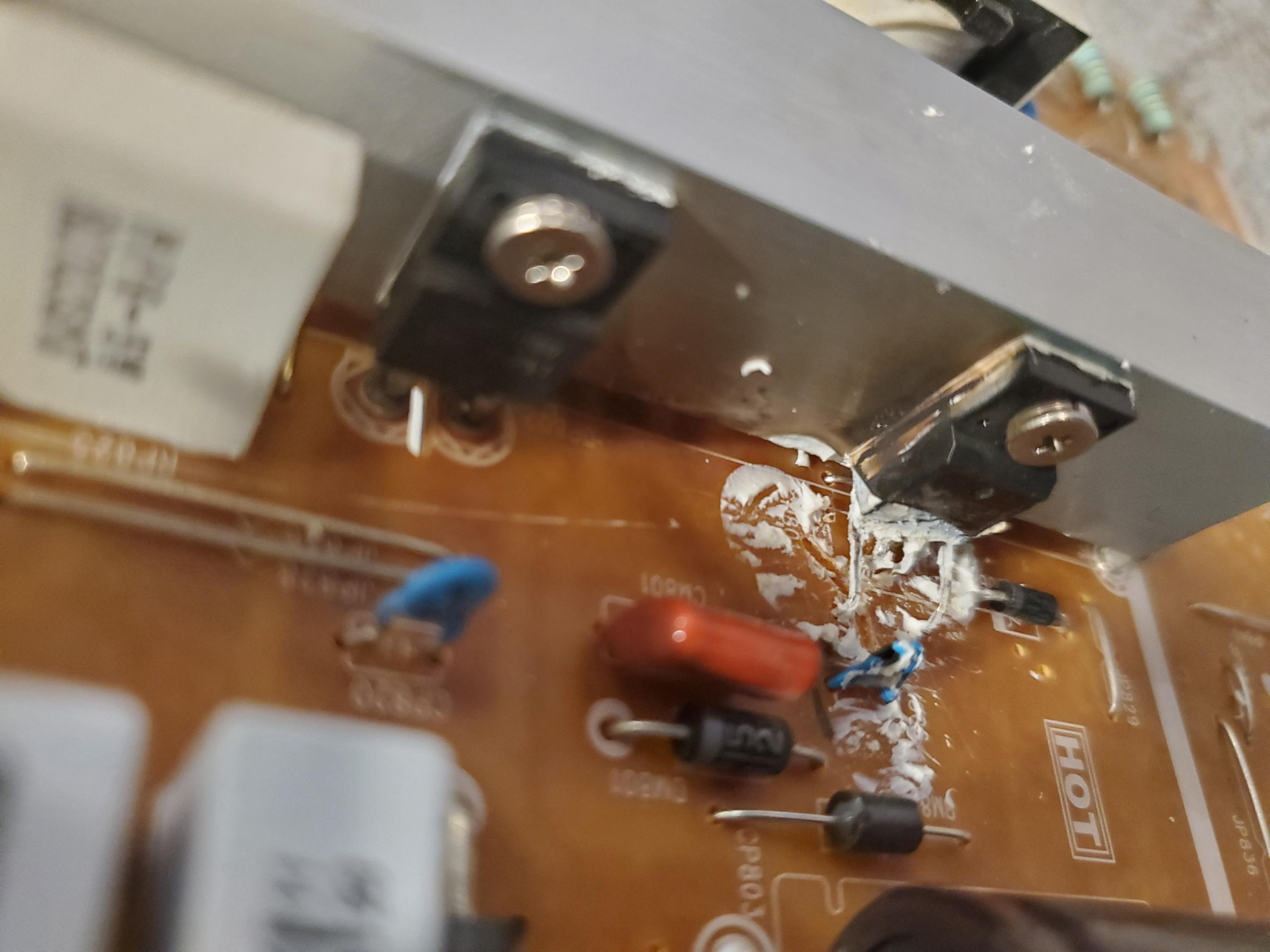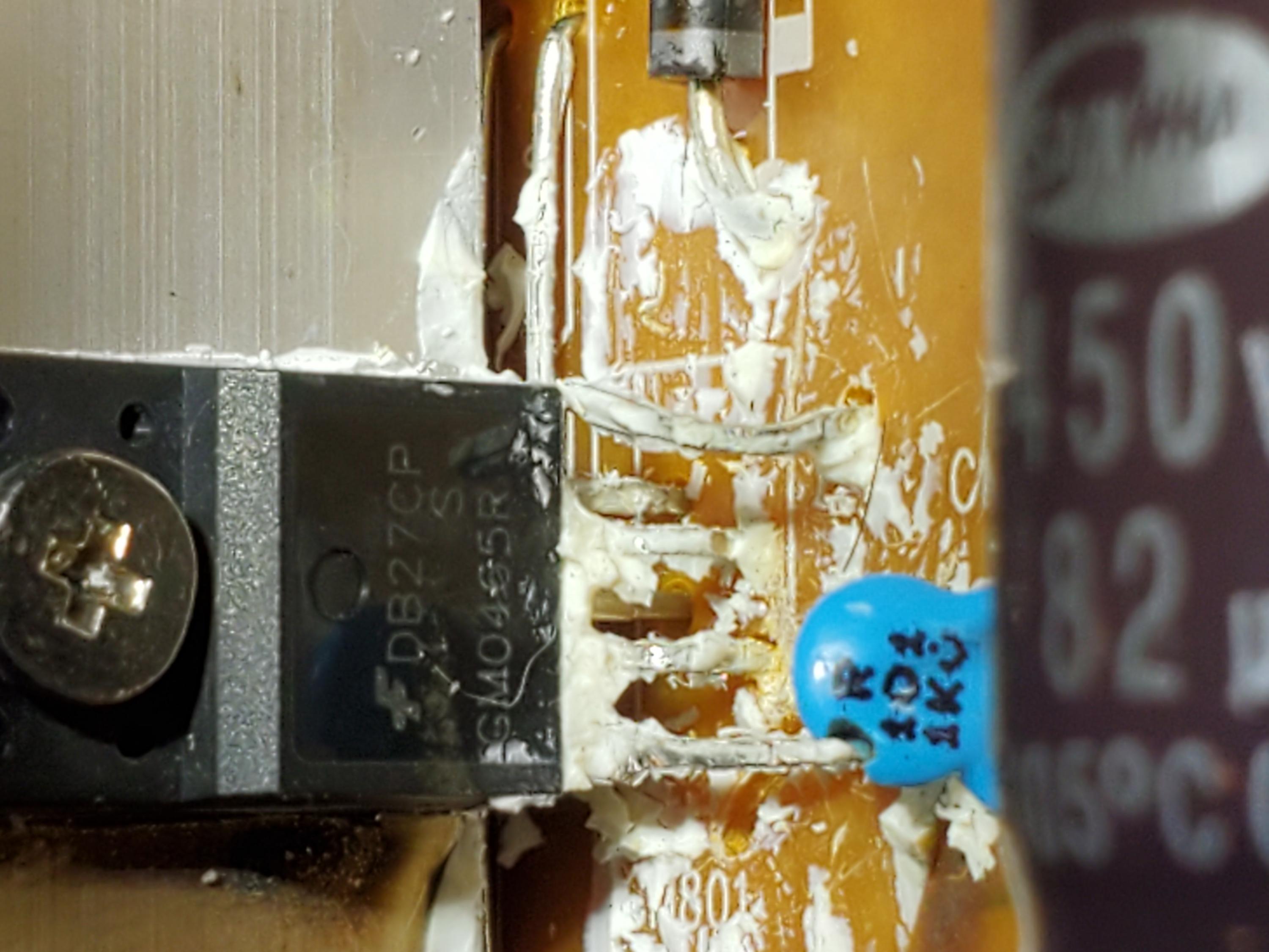 Here is what's under the glue. It seems like the left pin on the transistor is shorted to ground. I'm not getting a zero reading but it's close. Also looks like the blue ceramic resistor has a chip taken out of it. Looks like it burn out the side of the transistor. What is that white glue for? Is it too prevent fires?