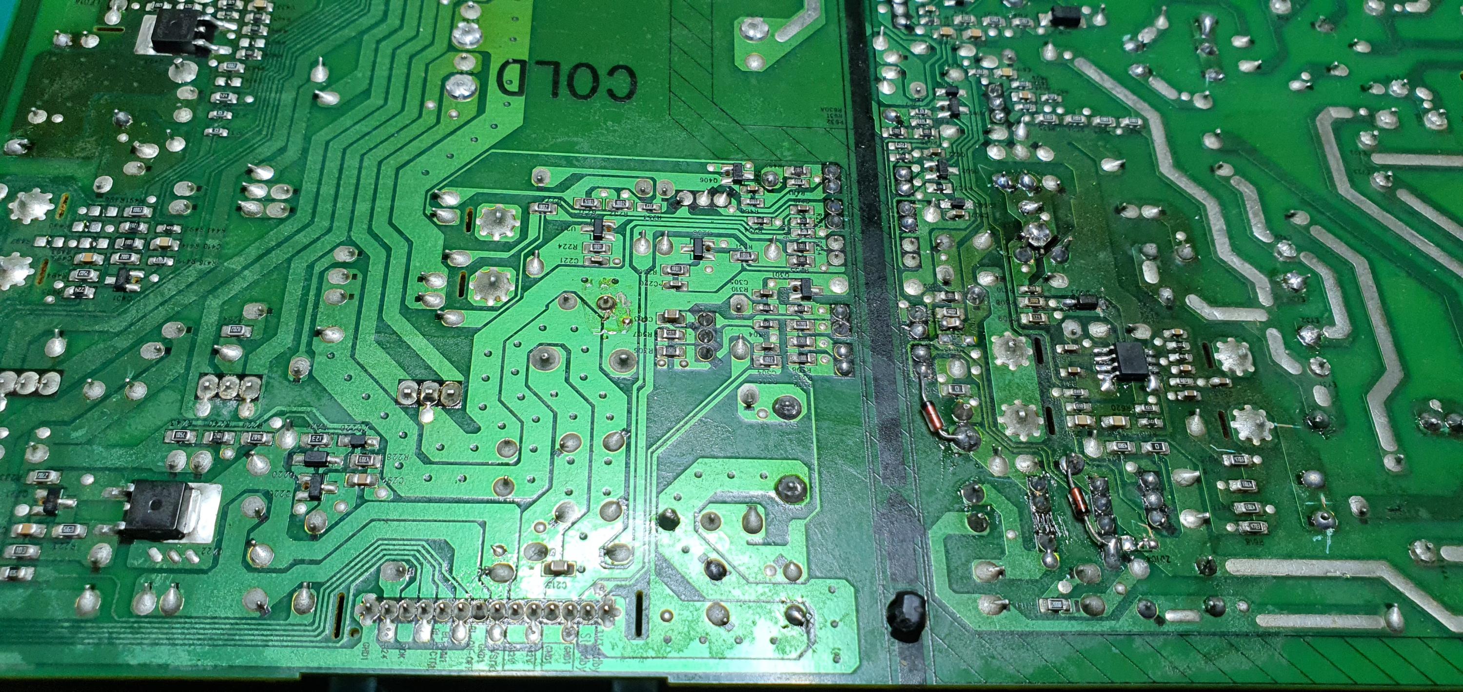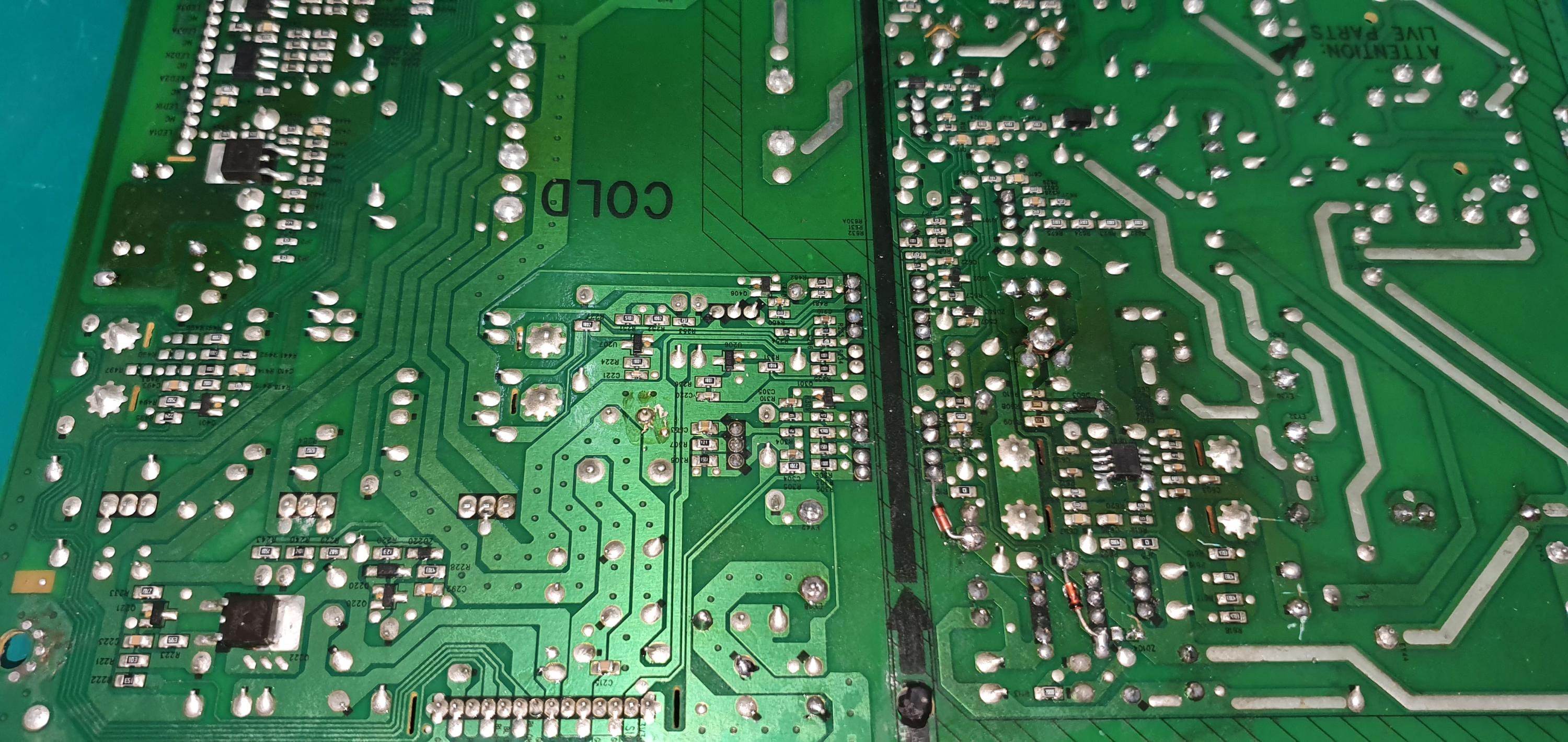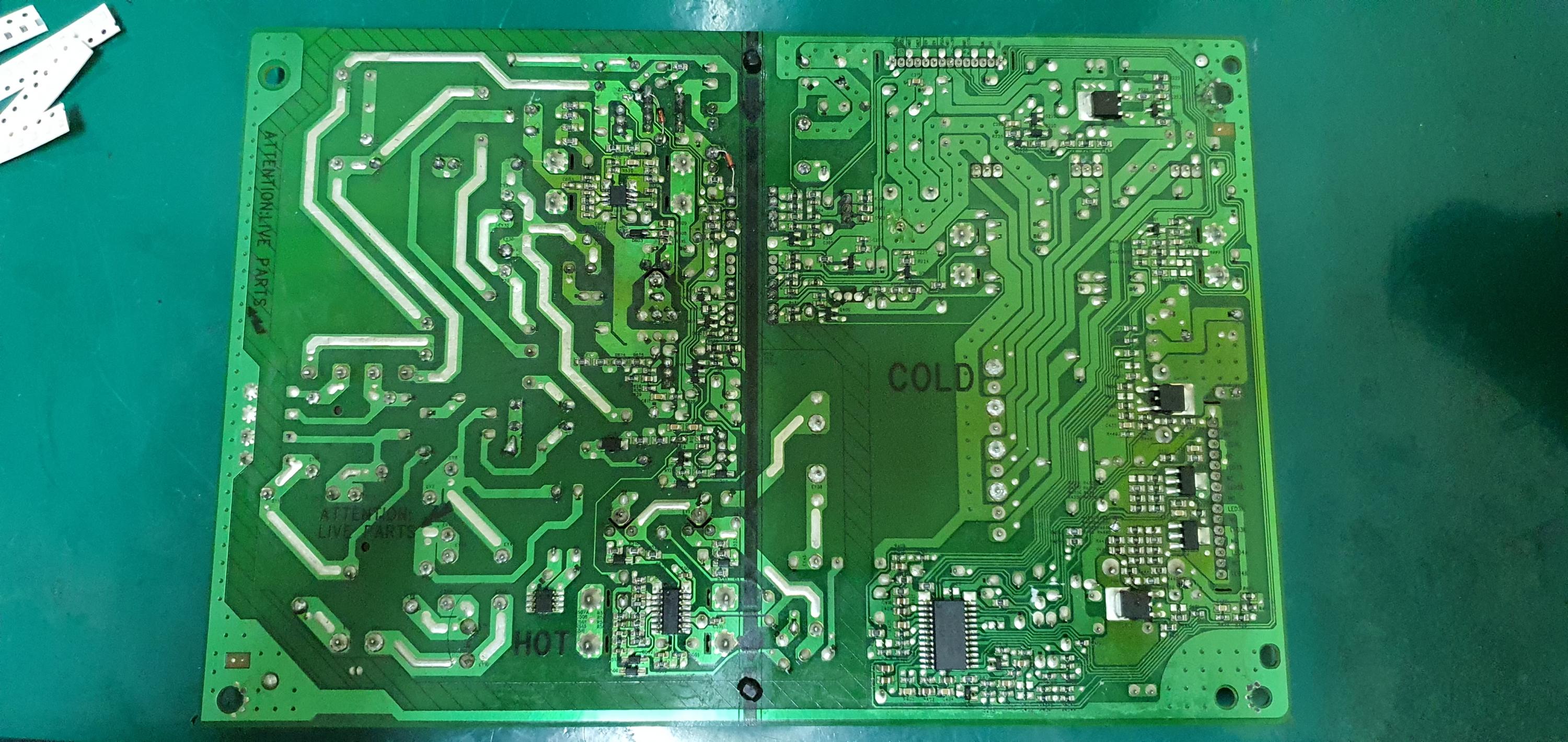 Please attach good clear hi-res of the whole top and bottom side of the power supply board for us to look at. Uploaded
