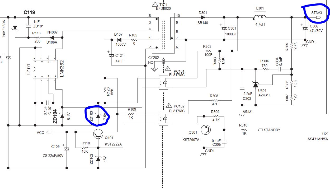 Hi, i have a phillips 46pfl6606h tv here with no power. fuse blown, power ic blown, diodes blown due to excessive voltage. Ok now i have fully repaired the high side of the psu. As for the low side, on the standby voltage there suppose to be 3.3v but its showing 6v. Is that something i need to be worried about? According to the picture i attached, the marked diode was blown, and it says 7.5v zener diode, so i replaced with 7.5v zener diode. Unless its a 3.3v zener diode? Even i measured at the photo coupler leg it measured 6v.