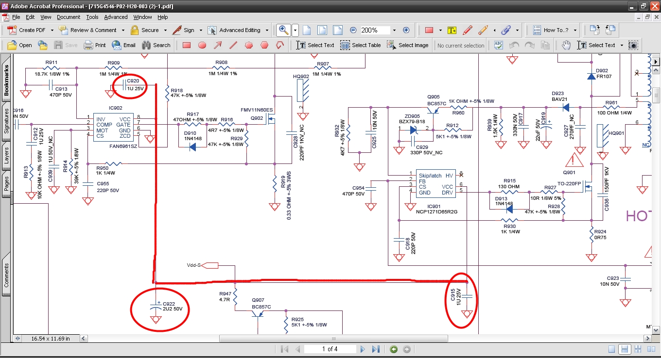 Now we have to find out which circuit is causing 266 Ohms reading on C922, it can be the PFC IC902 of the 12v/24V SMPS IC901, MLCC C920, MLCC C915.