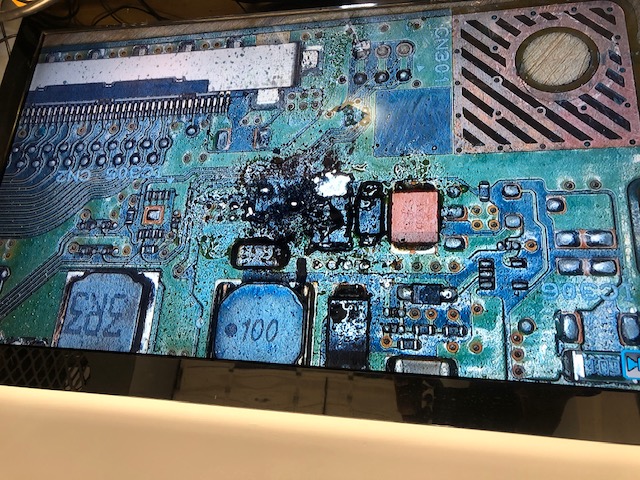 So fast forward to me tear down and diagnosis. When I got it home I did a hard reset and discharged the capacitors as well. To no avail,when powered one the led would flash a few times and go back out. Then I could turn it on the whole screen would flicker and go out and make this static type noise like something was shorted. Also by screen I mean the back light would flicker once and go out. So I thought ok maybe just the back light circuit is the issue or the power supply board as the circuit is on that board.