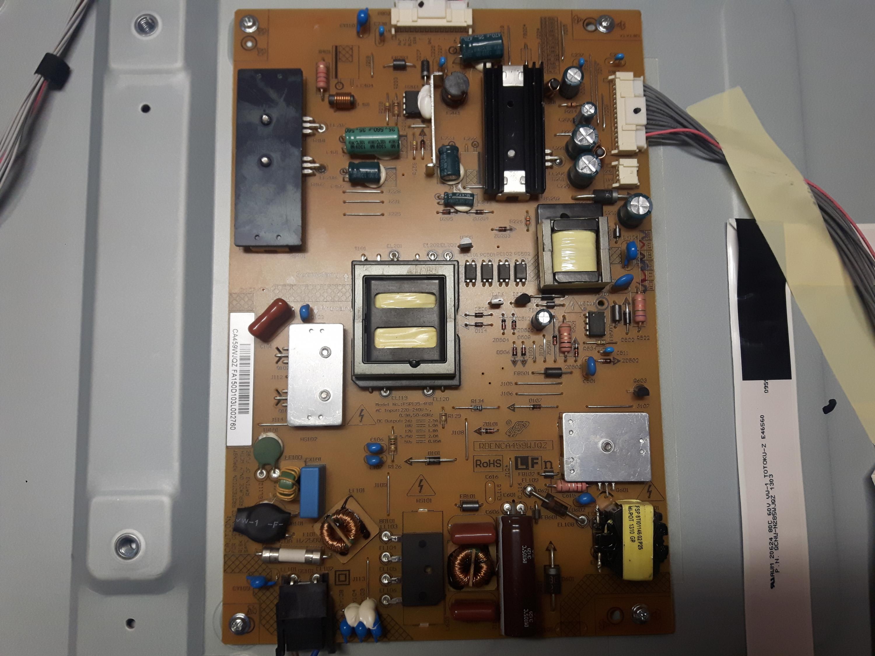 When power is plugged in, the indicator light will turn on blue, the backlight stays off and nothing is visible, even with a flashlight. When pressing the touch buttons on the tv nothing happens. When pressing buttons on the remote control the indicator light will blink indicating the IRsignal was received, but nothing happens.