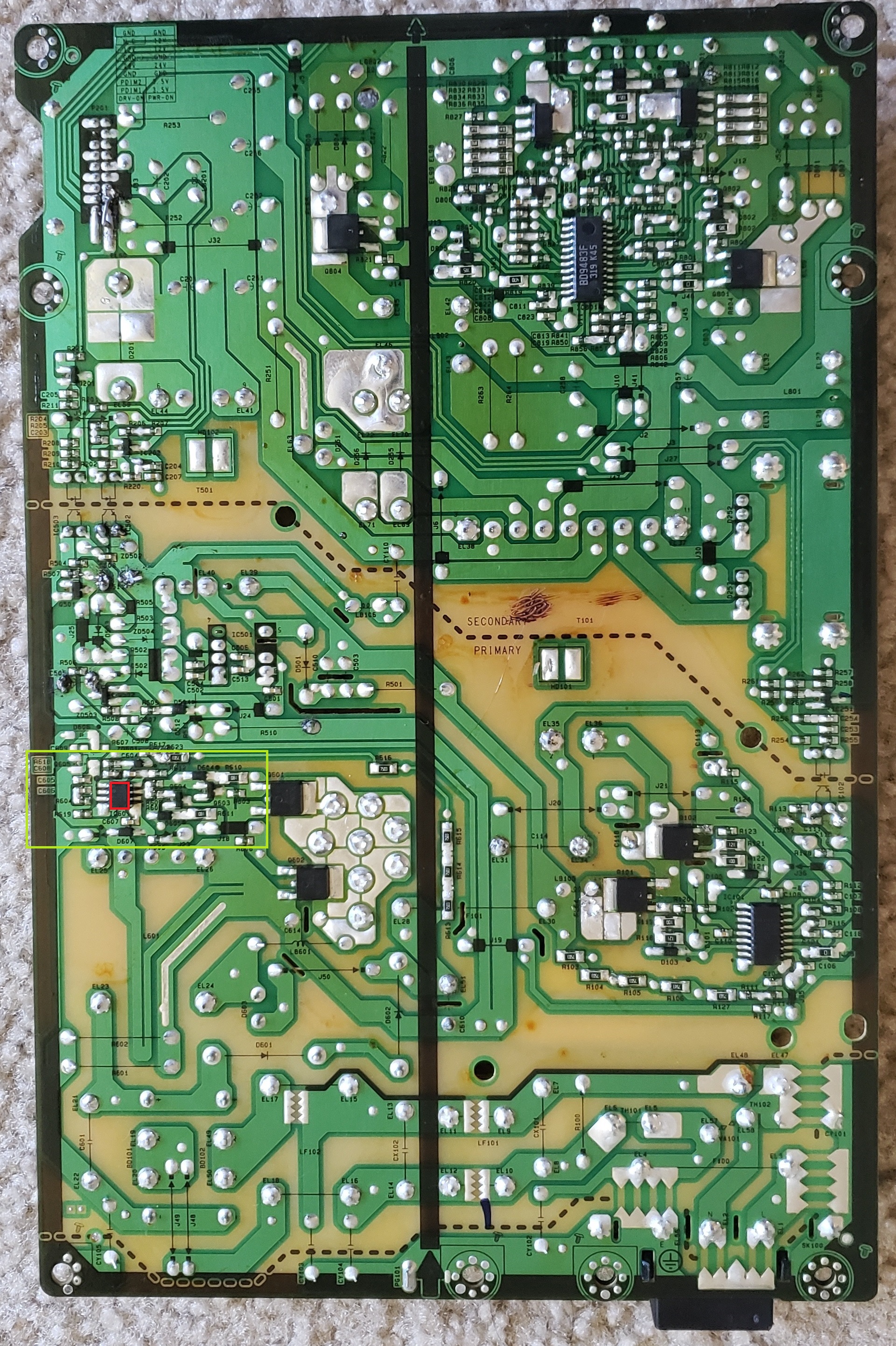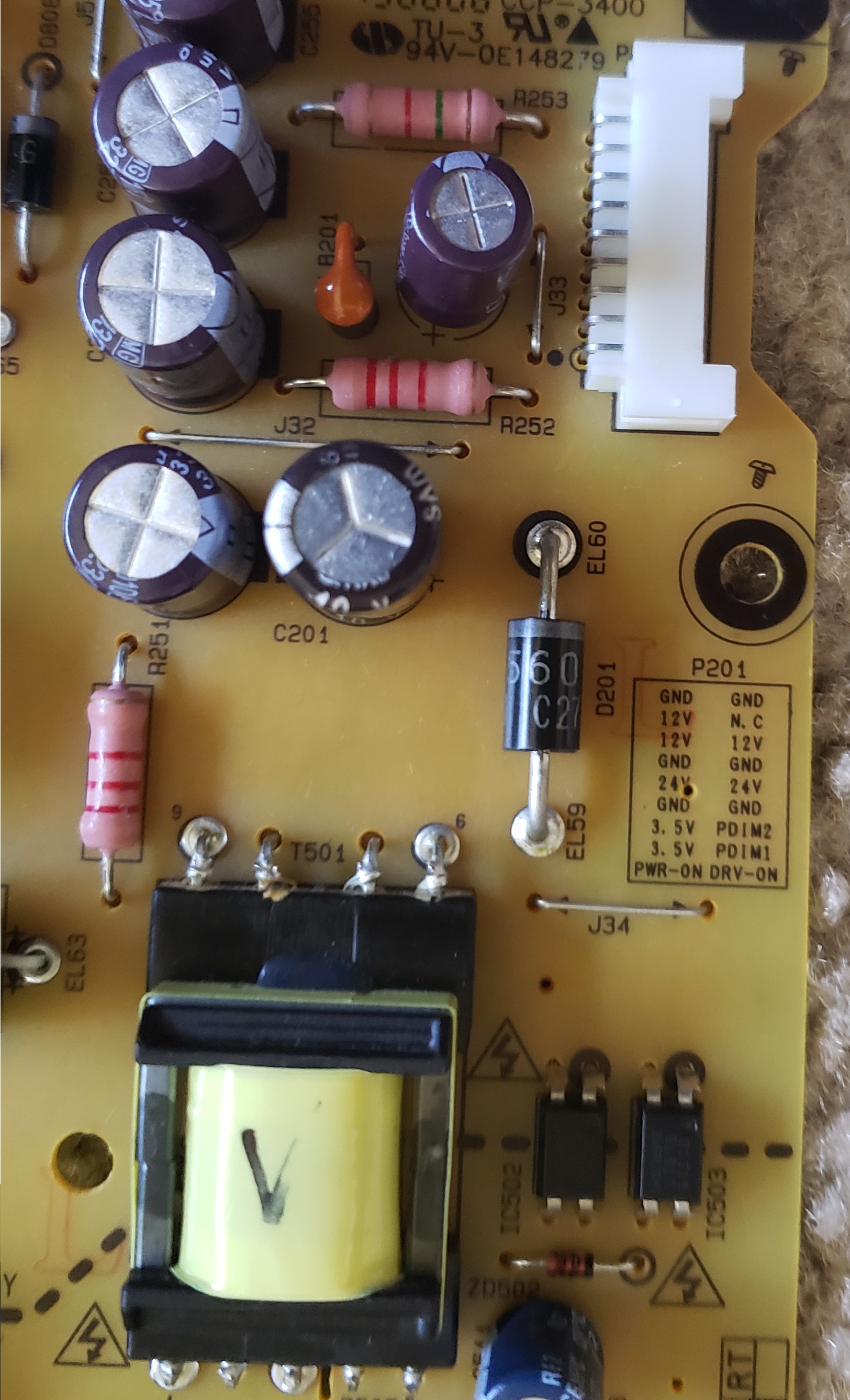 I have smps board which is not powering up. I'm getting 3.5 standby voltage though. After shorting PS ON with ground not getting any other voltages like 12V , 24 V on other pins. Any help would be appreciated.