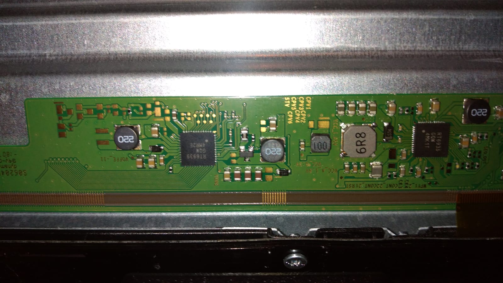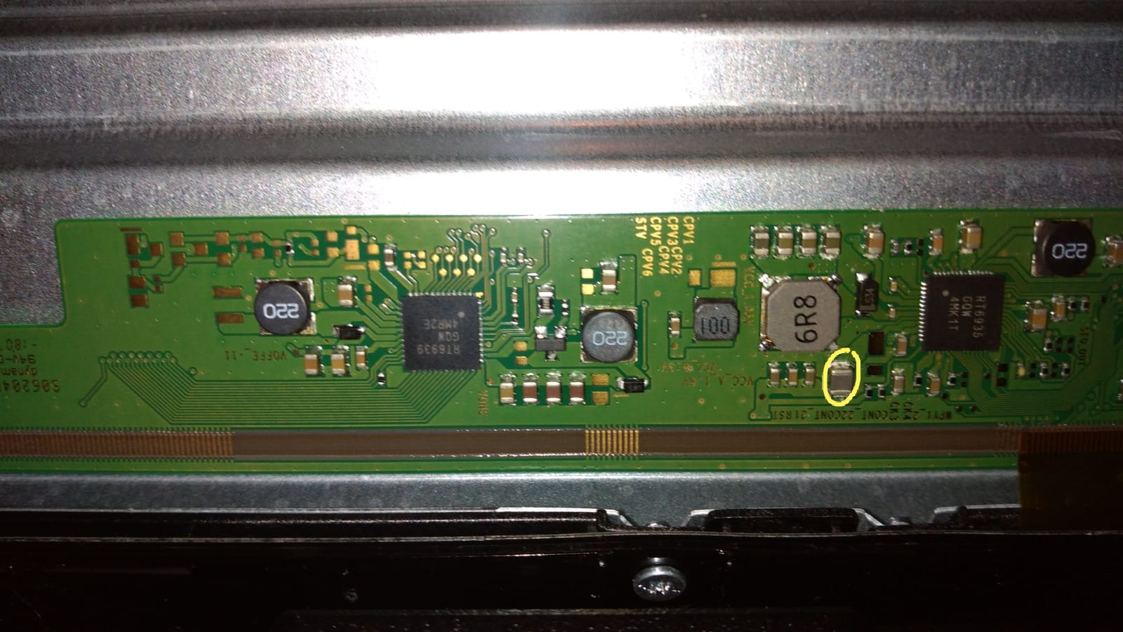 As per title says, I have an Toshiba D-LED TV set 49U5863DB made on Vestel backbone: 17MB130S motherboard, 17IPS72 power supply and VES490QNDS-2D-U12 chassis which has backlight but no image is displayed. Even so if is hooked up to a input source, sound coming up okay, picture still missing regardless the input source. There is a bit of remote interaction as you can turn on and off but that's pretty much it, there is no control on volume. What I've done so far: because there is no blinking and the TV is booting up fine, I assumed the power supply and mainboard are okay and start straight by checking LVDS cable integrity (okay btw), input voltage on display board (I'm not sure what's the right name for it, it's the board at the end of the LVDS cable) and has 12.2V measured against the TV chassis. Next I looked after Vone which measured against chassis returned 0V. So, I start looking after bad capacitors and found the SMD in the picture having a shortcut.