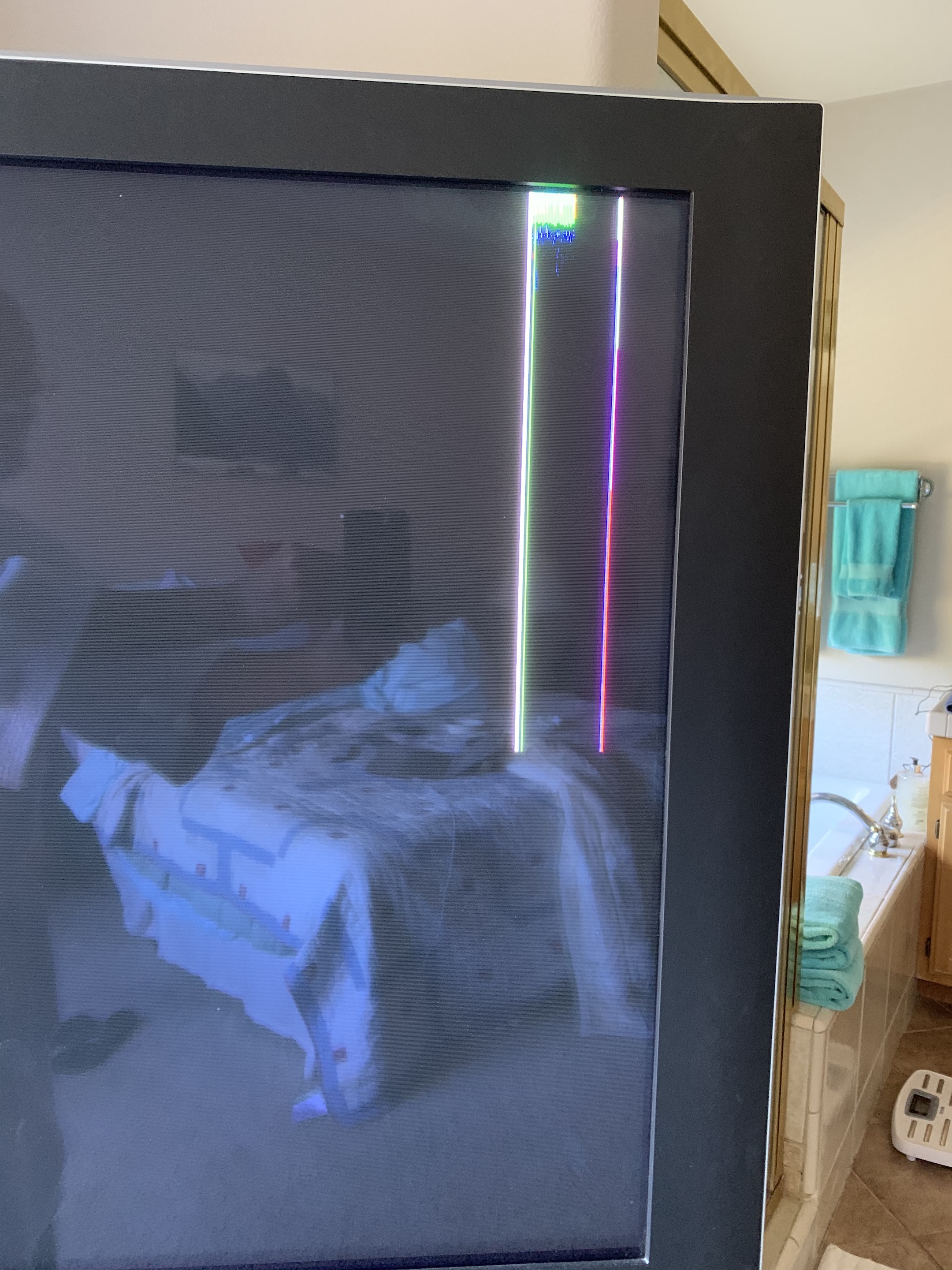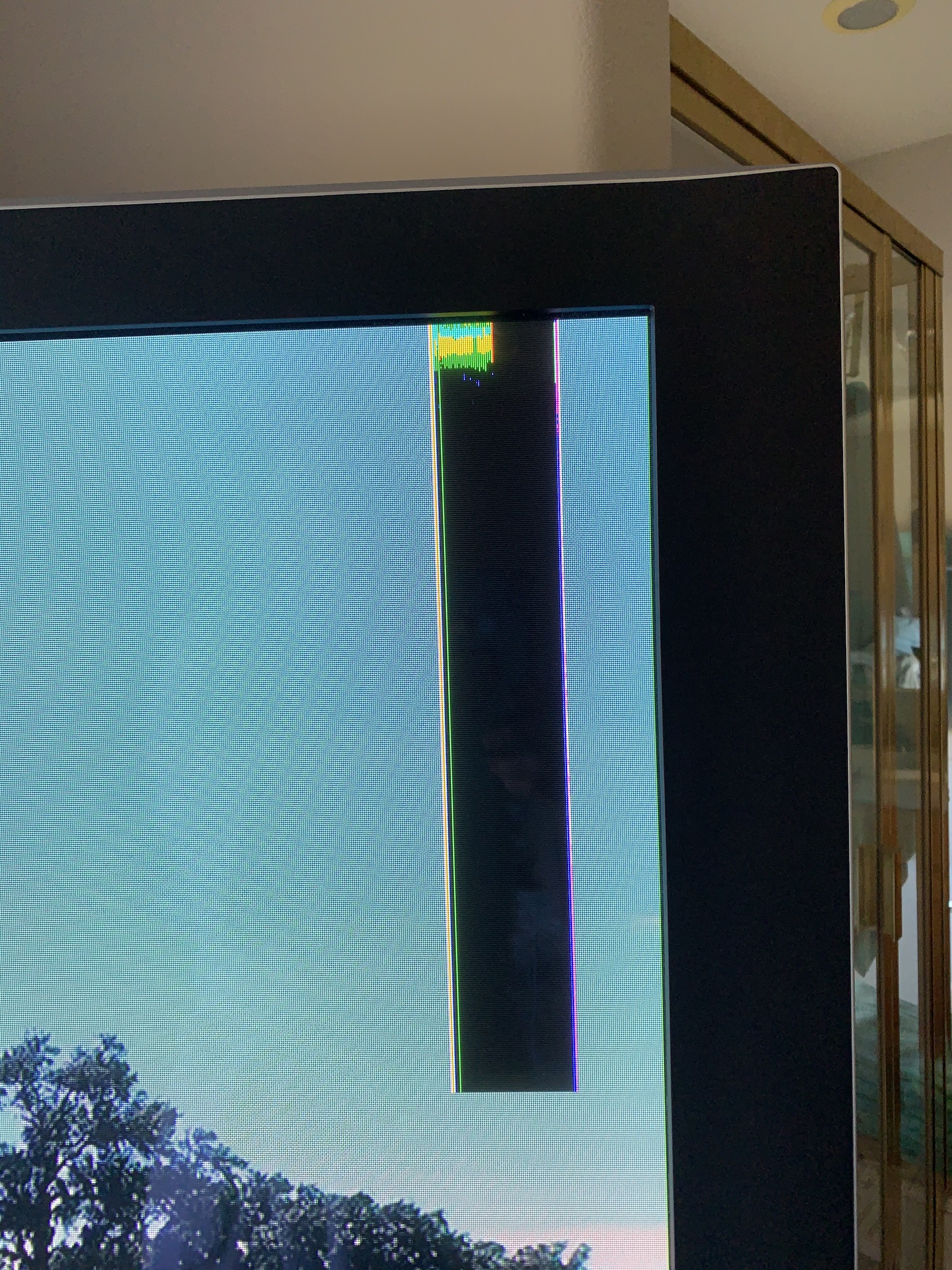 Hoping to figure out if the panel is done. A week or so ago this stripe appeared on right side of display. It is there with all inputs. Pictures attached. the picture and audio are not affected. I tried disconnecting ribbon from buffer to panel and it does not change. Disconnecting the ribbon next to it yields the expected white stripe. There are vertical buffers on top and bottom therefore the 1/2 screen stripe.