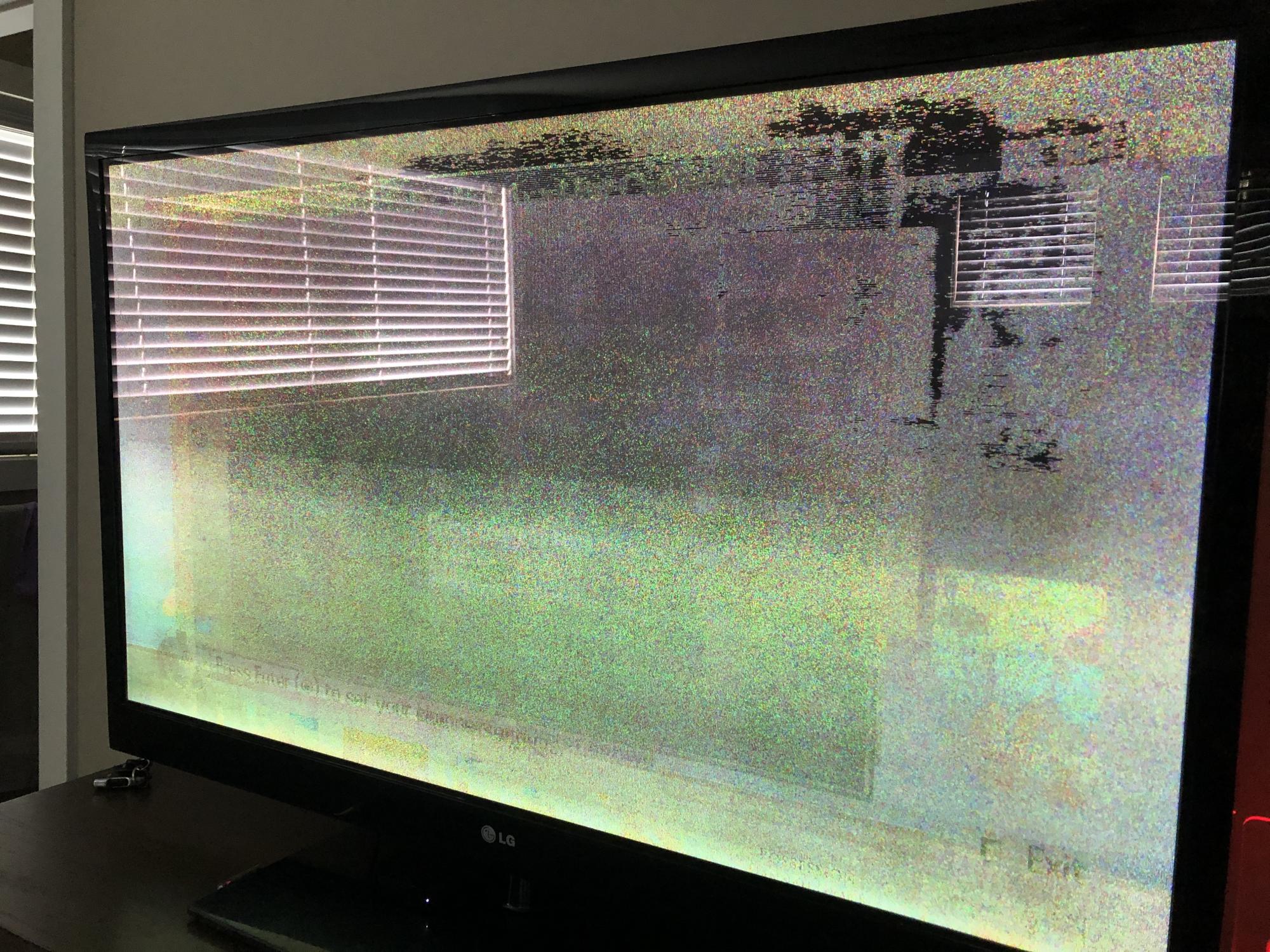 The screen is very fuzzy and has black patches and also very bad ghosting. The first two pictures are without anything even plugged in and you can still see ghosts of the exit buttons from the TV box.