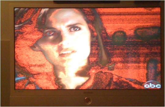 A 52" LG LCD at the bowling alley has a very similar flaw. Anywhere where there is black in the picture, red snow fills in. Not nearly as bad as this though.