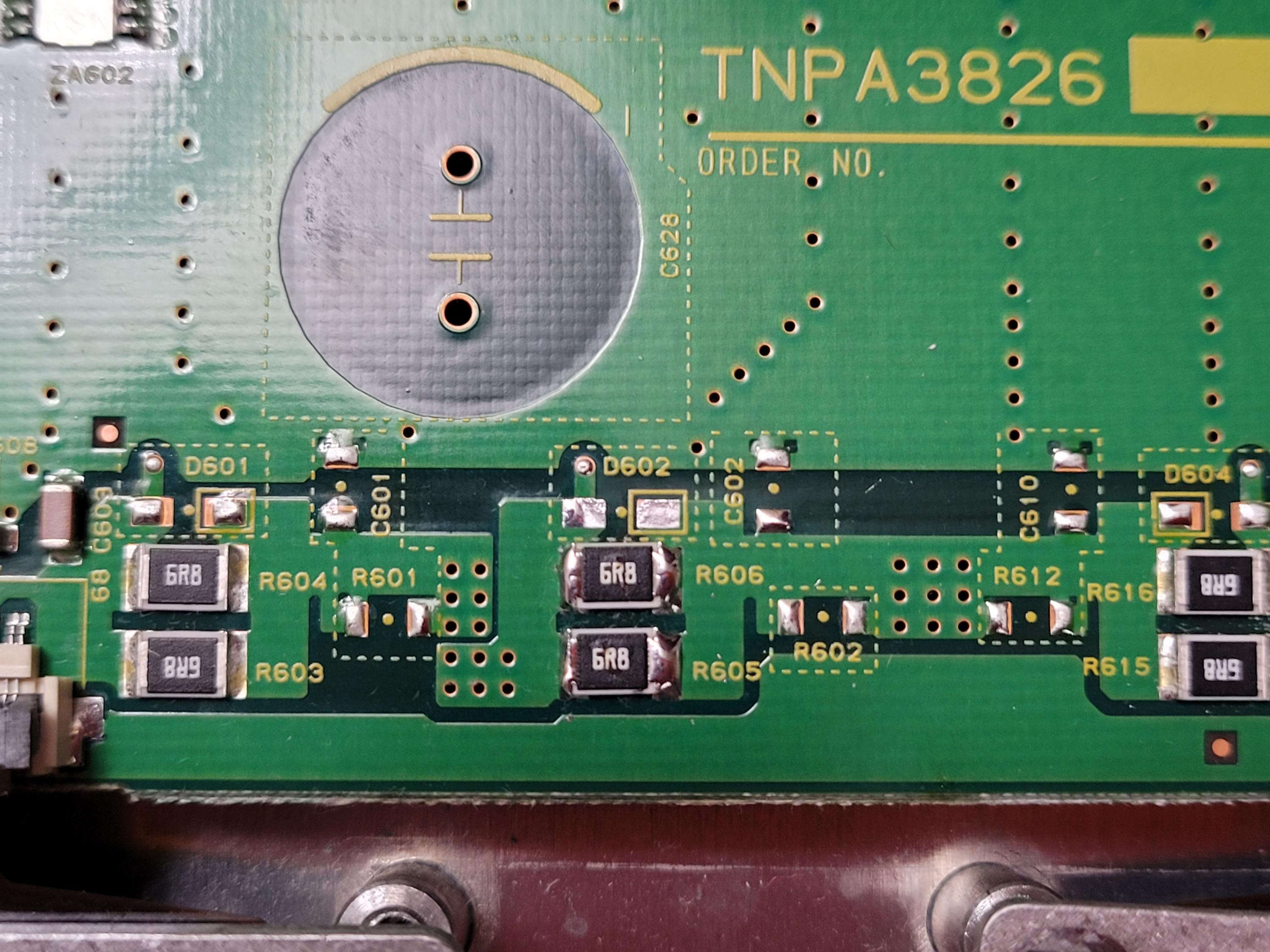 I started with the bottom right black bar as it was closest to me on the desk. I found that the two 6.8 ohm resistors pictured were open circuit. I removed them to verify and they were blown. According to the schematic, these are for the 75V VDA rail.