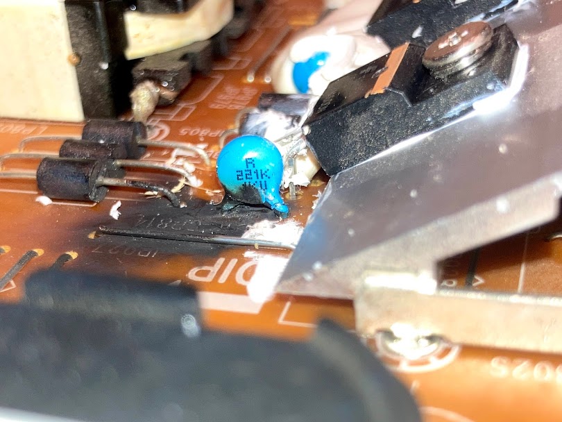 Months ago, an LED strip seemed to have gone bad (took a while to understand what the issue was). Then one evening, the TV was on, working fine and then "Pop, Pop, POP! zap" the TV went off. Took out the power supply (BN44-00621C) and discovered an obvious capacitor had blown.