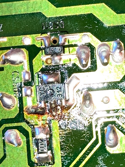 The only other thing that visually looked weird was this "chip". Again, on the back side of the circuit board. I have no clue what it is or how to test it. Markings seem to say "YC" and "312". I say it's weird because the solder looks rough, like it was melted and refroze.