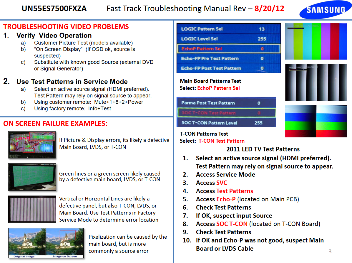 Photos attached of the symptoms. I followed the service instructions in the slide below, but got stuck at the tcon test patterns.