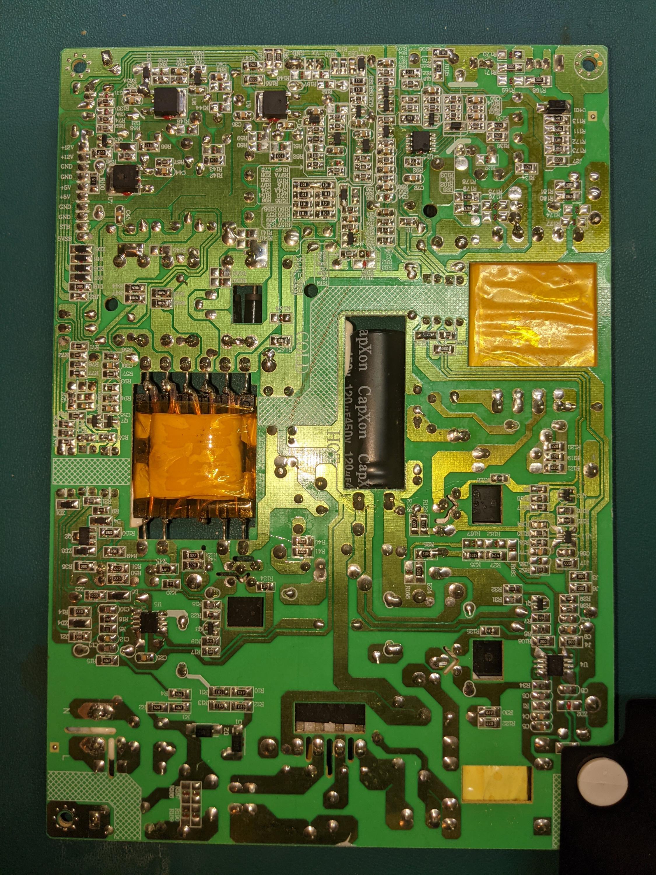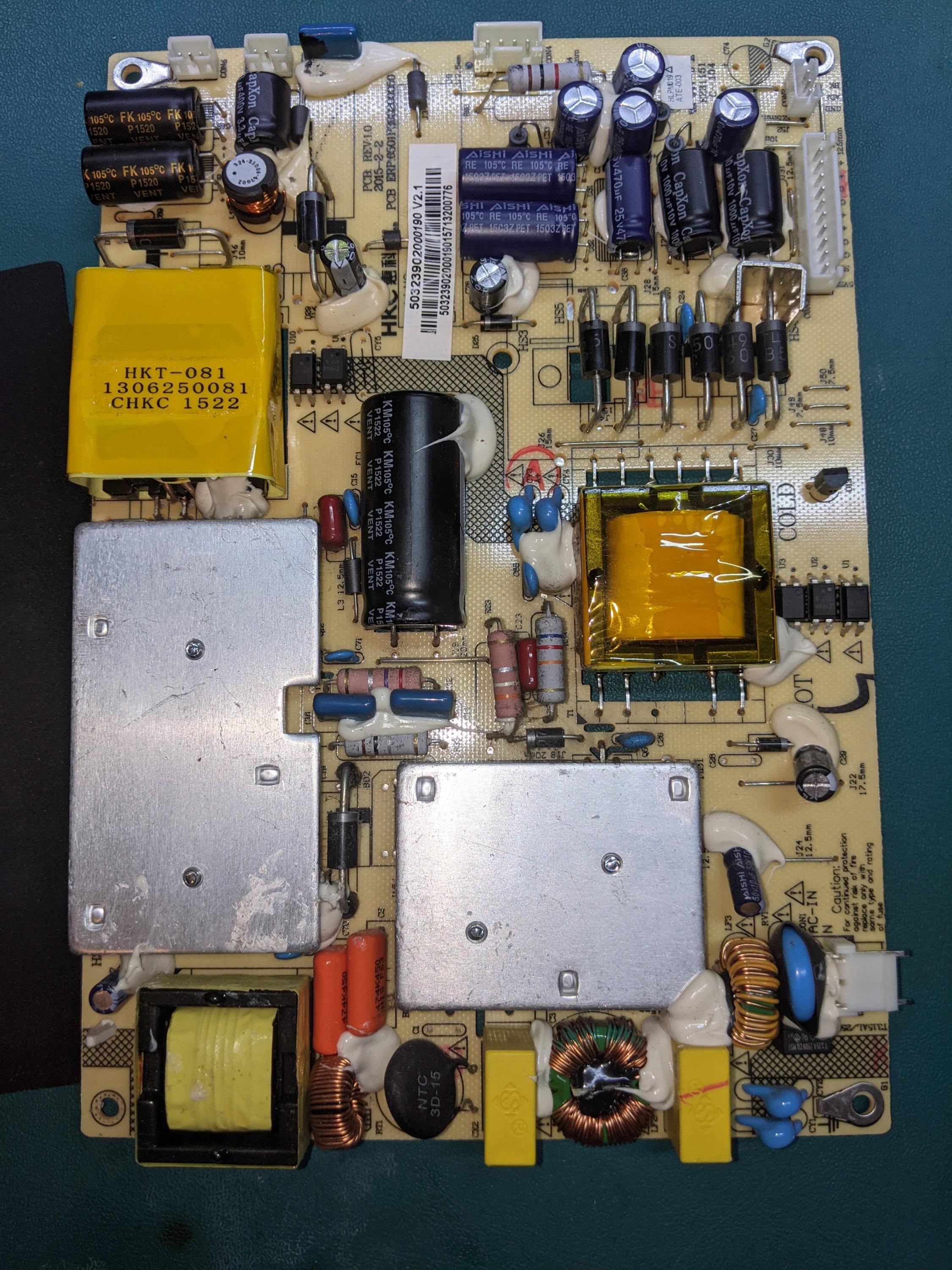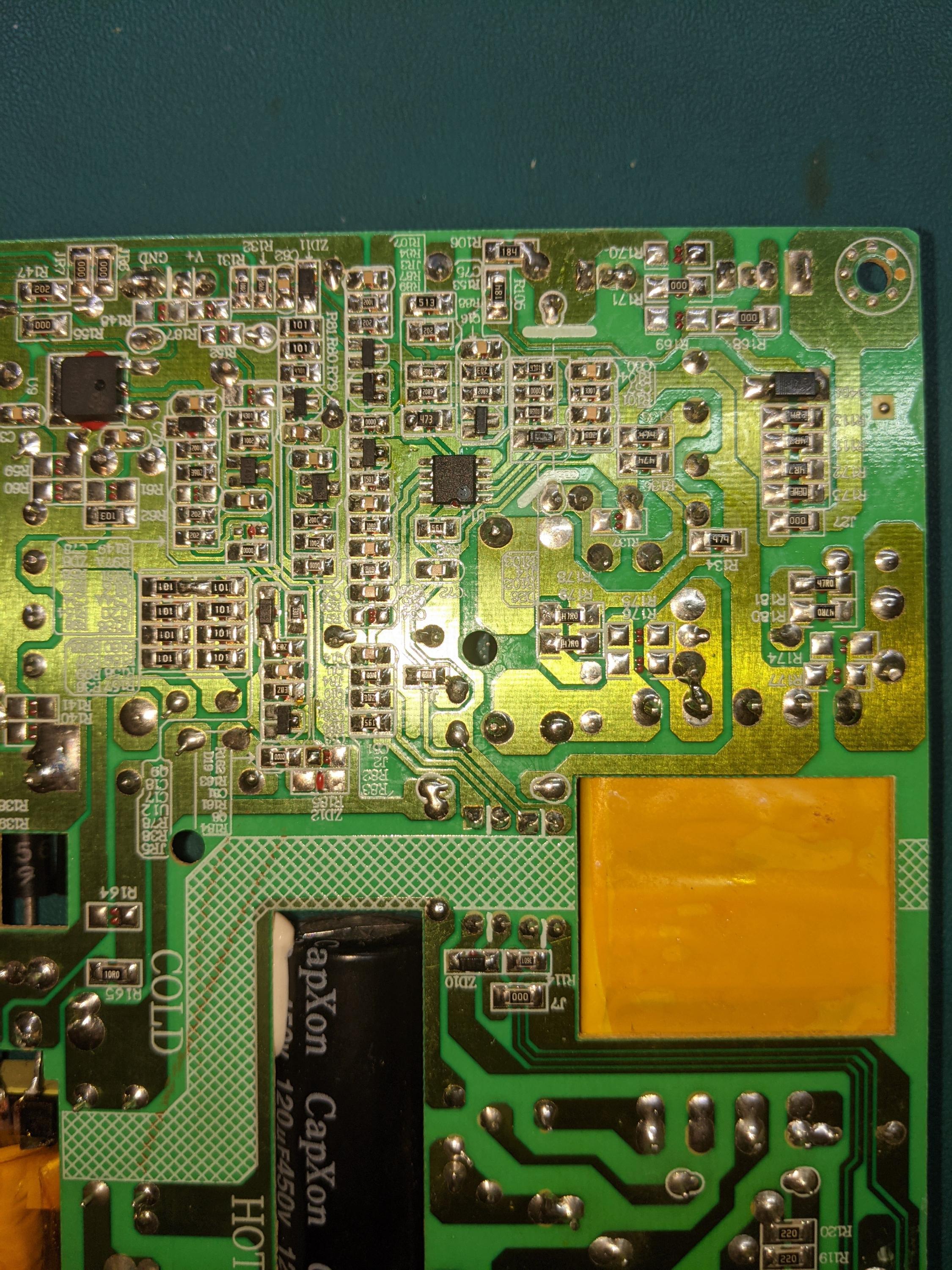 Perhaps the great minds here can help me figure it out, as I don't see any thing obviously wrong with it. The backlight circuit seems to be controlled by an op-amp (U14). The part number for this op-amp is 10358. The hot side of the board is controlled by a FAN7930C PFC controller. I have not found any shorts on either side so far and the capacitors look to be ok.