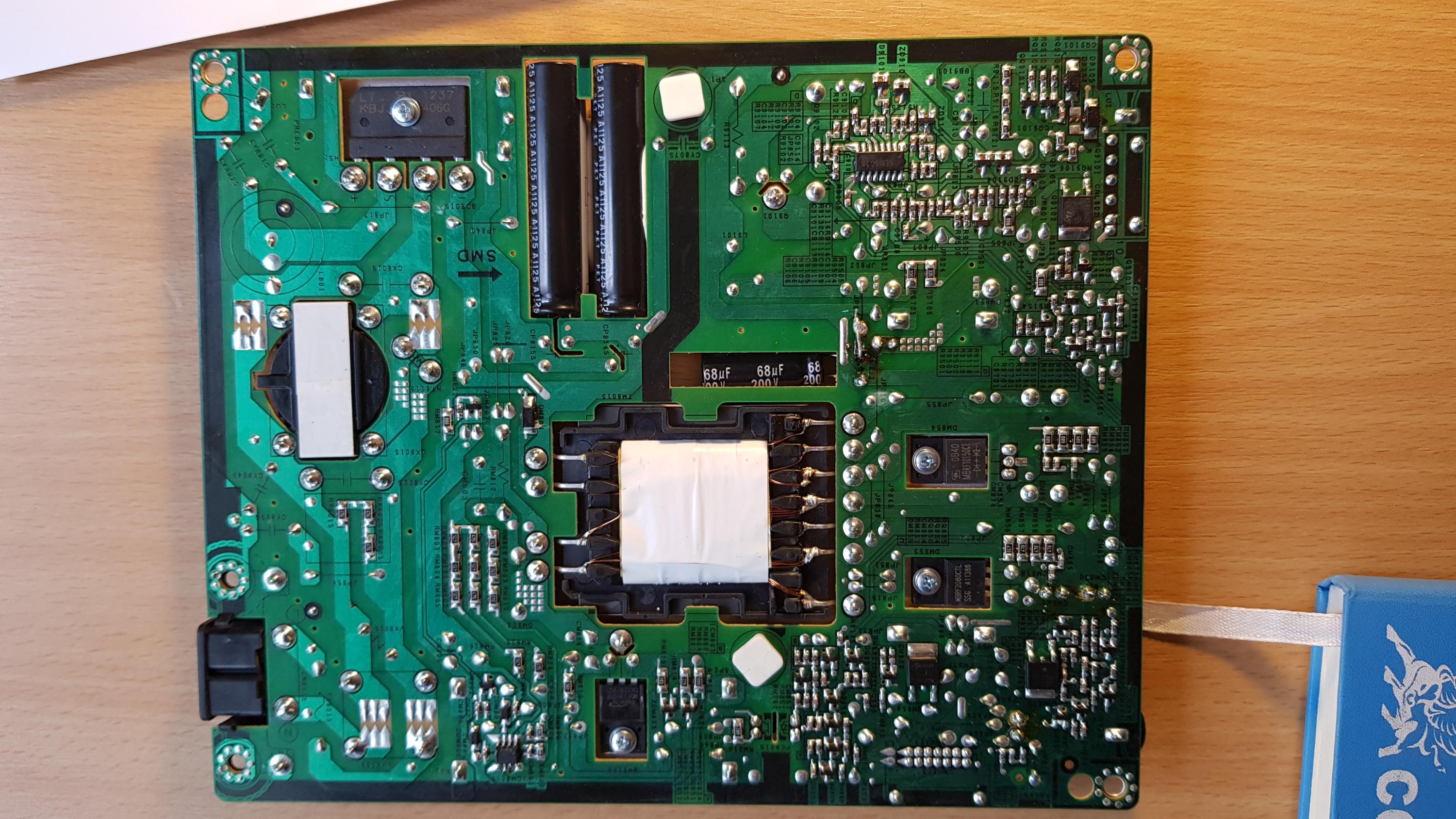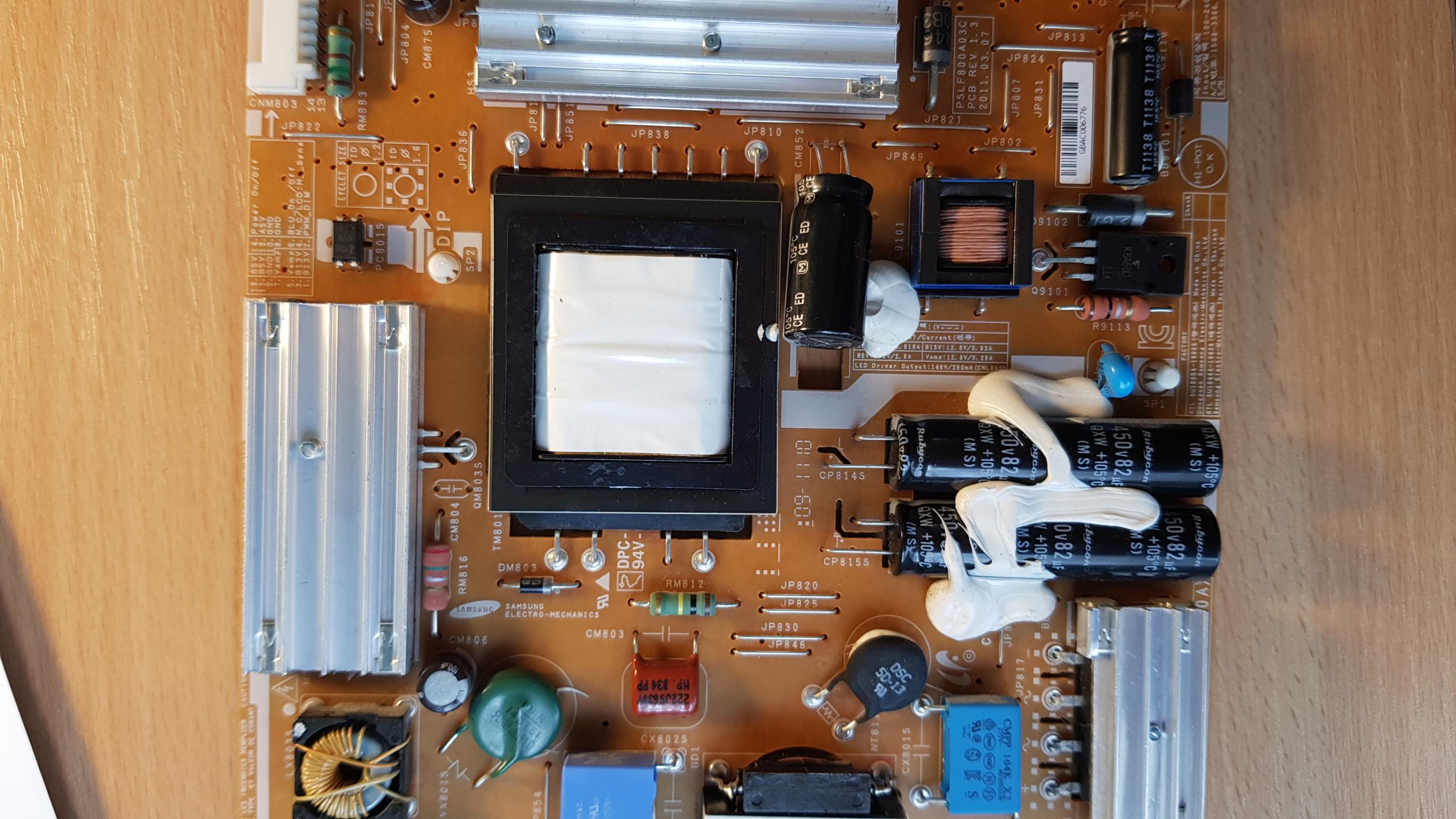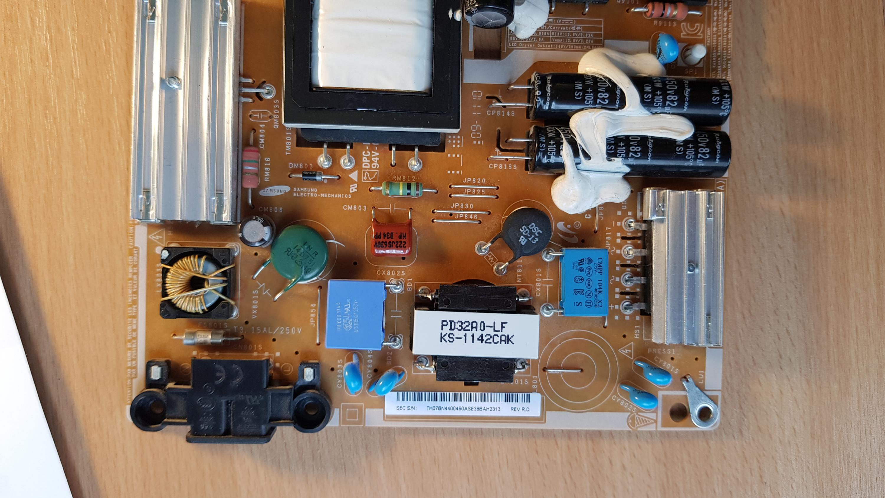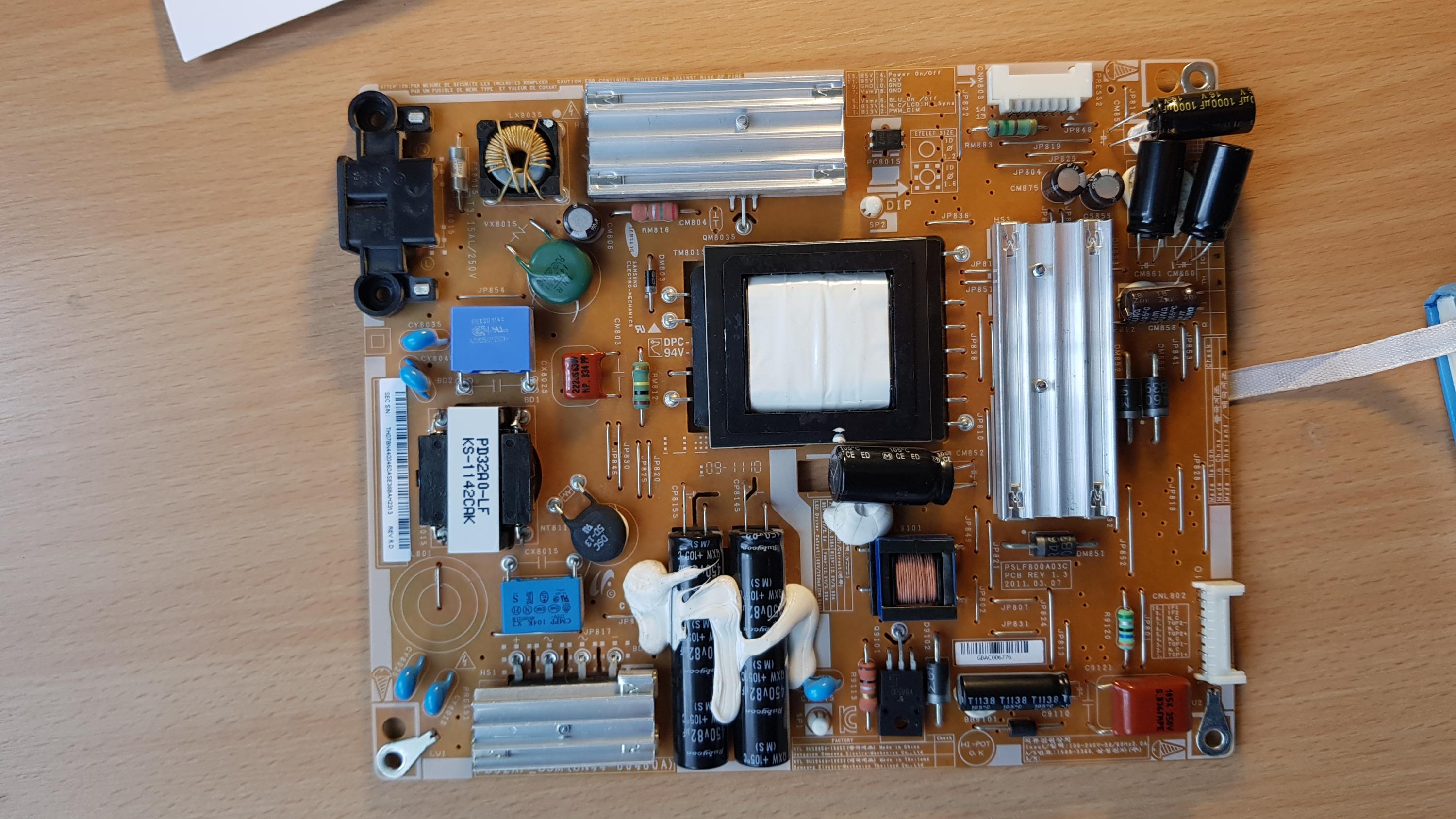 I'm having an issue with my son's Samsung UE32D5520. The television will turn on and off within 3-5 seconds. The screen starts, I get the Samsung logo, then it goes black and off. I have replaced 3 capacitors (2 x 16V 1000uF and 1 x 200V 68uF) on the power board (BN44-04660A) as a shot in the dark after reading some information online.